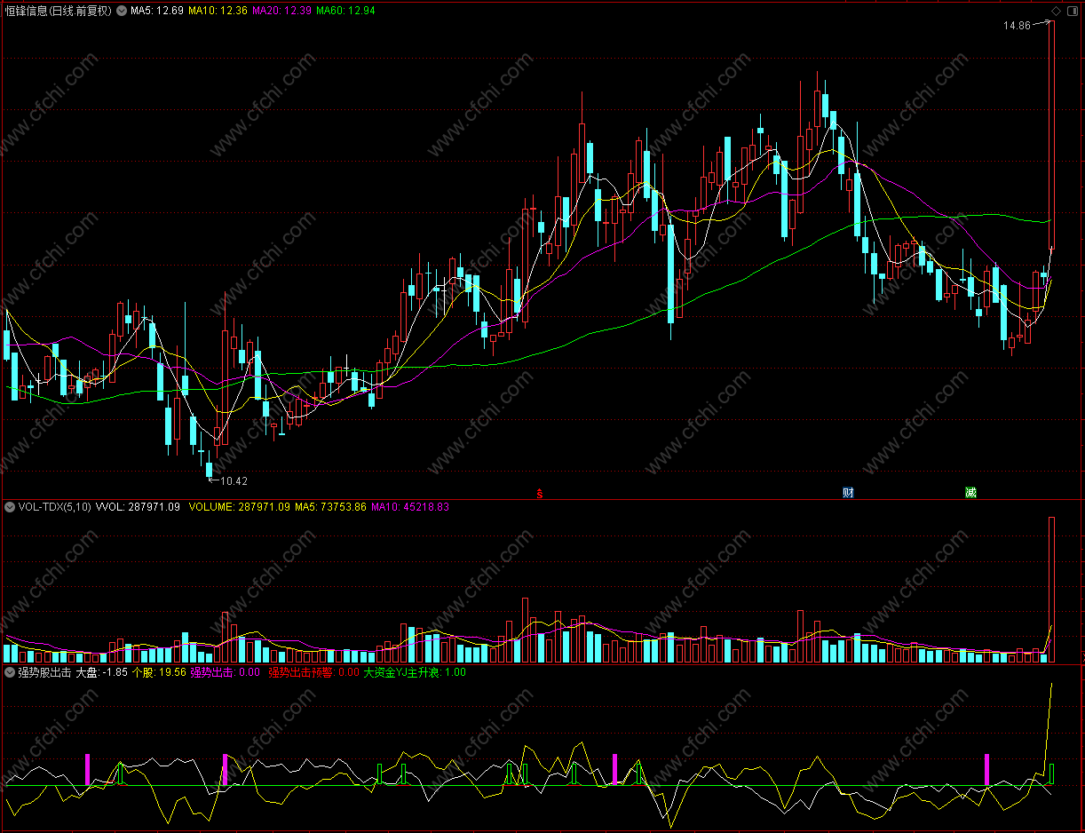 紫色的强势出击信号出现,代表个股要强势启动了,这个时候分批介入,一般不会有追高的风险.