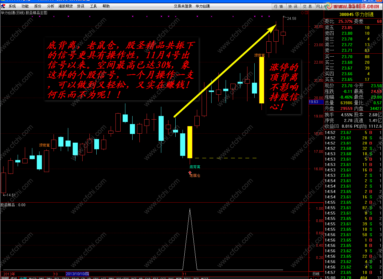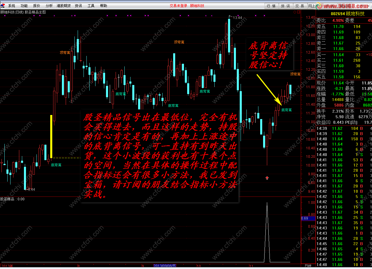 大盘是不用过于担心,主要还是如何精选个中的个股,如何做好高抛低吸的波段行情!这就需要我们不断地去摸索,不断的去总结!炒股本是智慧与人性的双修,交易的成功,是不断战胜人性弱点和自我的历程,古语说得好:财不入急门,欲速则不达,炒股也是如此!想今买明卖做一天两天可以,做一周也行,但是长期这样今买明卖对于小散来说肯定不现实。一是时间不允许,就算时间允许了,操作上和技术上不一定能跟得上,所以做股票在短线操作的同时我们也应该更多的考虑做一些中短线,做一些大波段。获利相对就丰富得多,说了这么多,今天给大家送来就是既适合于做短线,又适合于做大波段的一整套指标,(里面包含了主图,副图,分时指标)。主图相对比较简单,但副图指标是超准的股圣精品指标!因该指标设定了流通盘的大小,因为只有盘子稍少的个股波段做起来才得心应手,所以在指标里用到了流通盘函数,不包含其它任何未来函数!此指标熊市,牛市信号均匀,一旦购买,你将终生受益!