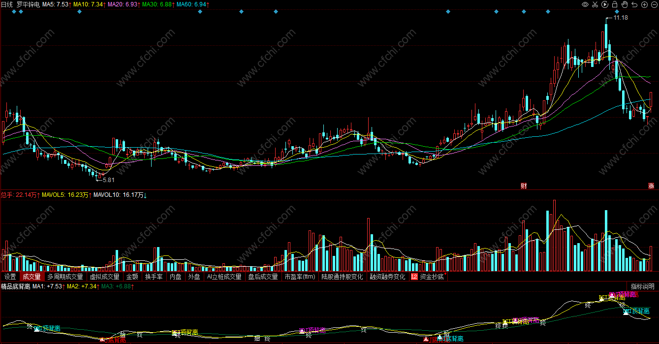 该指标是喜欢背离来选择买卖点的首选,融合了MACD、KDJ、RSI、DMI4种指标的顶底背离。底背离为买入信号,后势上涨概率很大;顶背离为卖出信号,后势下跌风险很大。