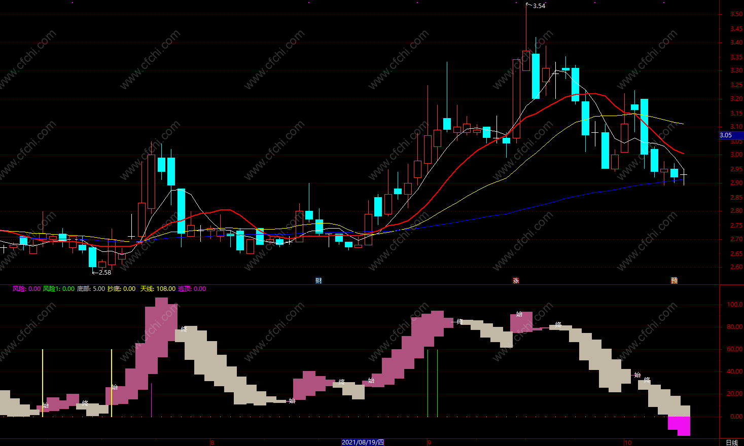 指标自带提示,发出“抄底”信号时候在结合趋势线,出现紫色柱子可以关注