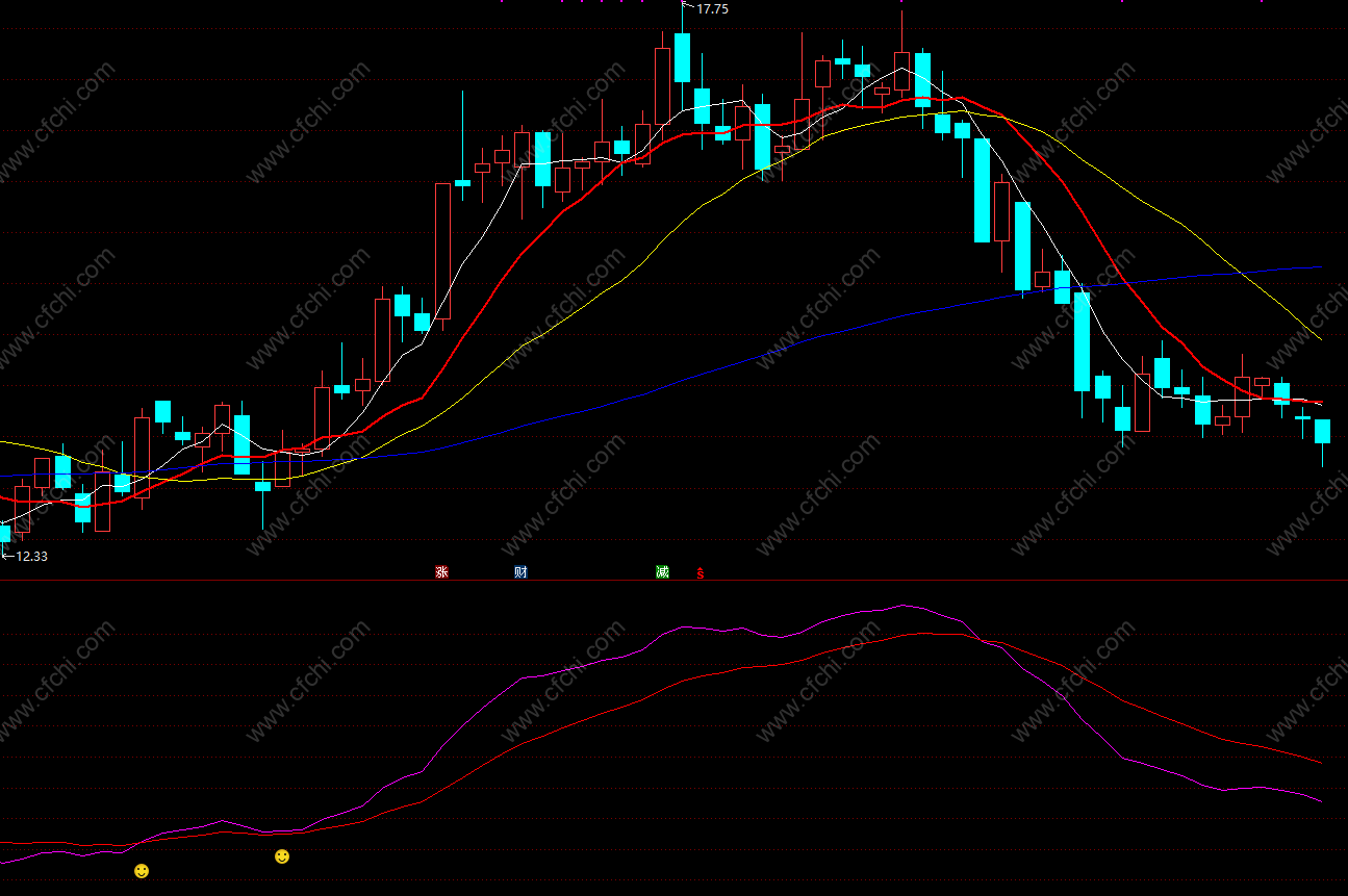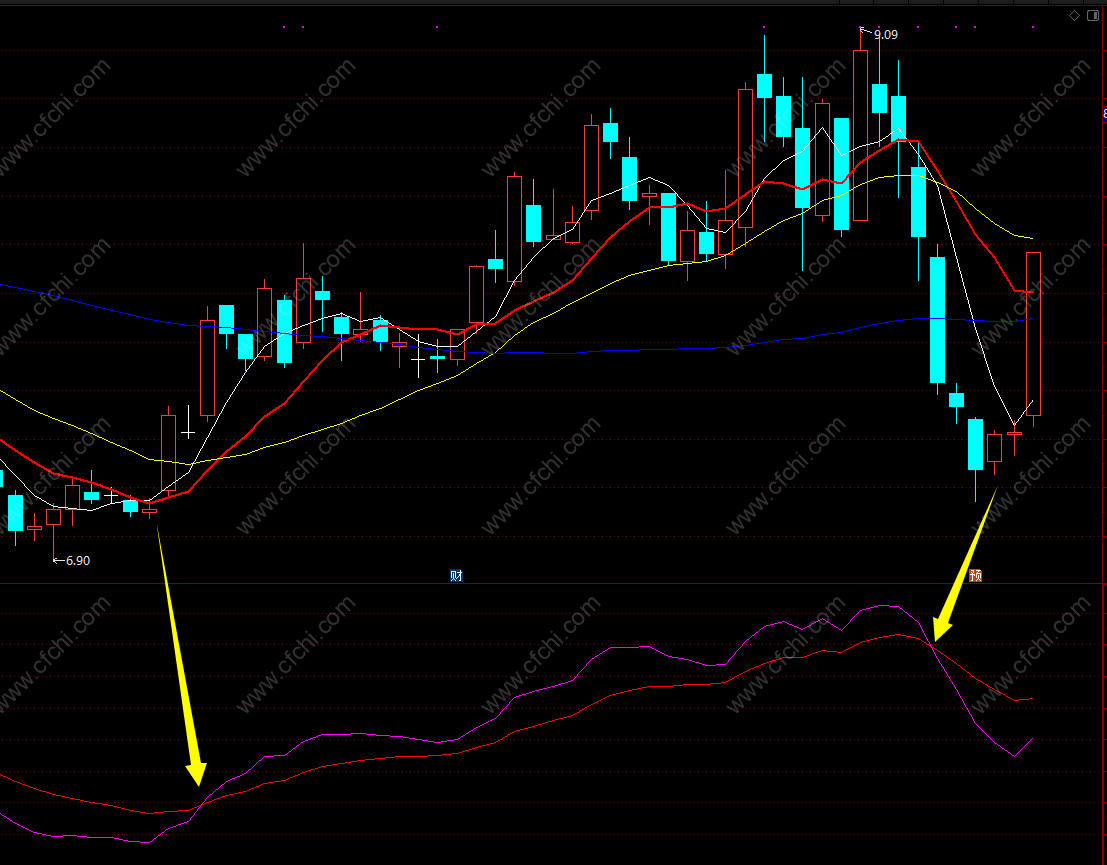 低位粉线对红线金叉时买入,如果此时配合股价止跌企稳把握更大。