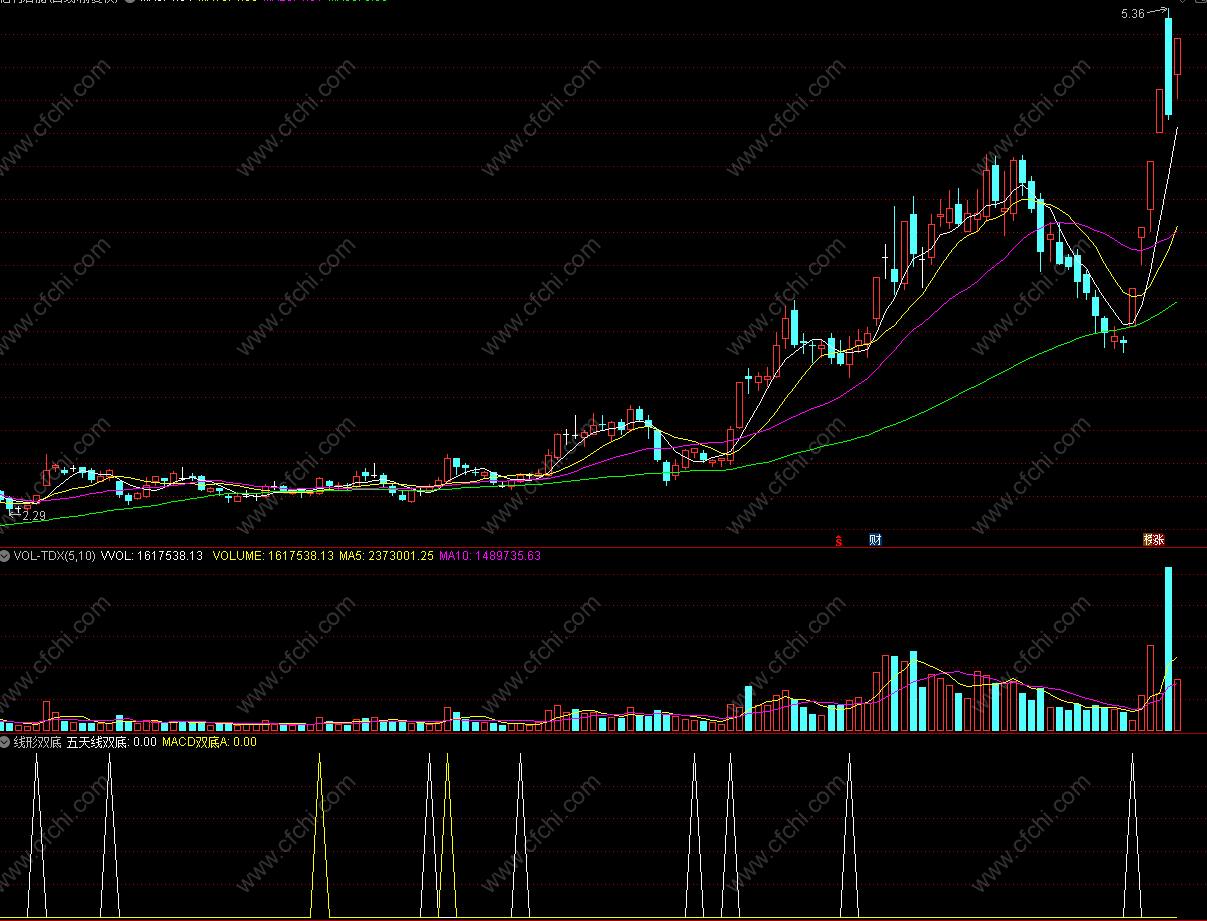 五天线双底:IF(JCSJ1=1 AND MA5>REF(MA5,JCSJ2) AND COUNT(趋势<0,4)>=2,1,0);