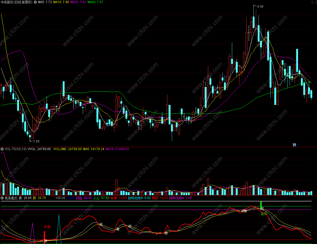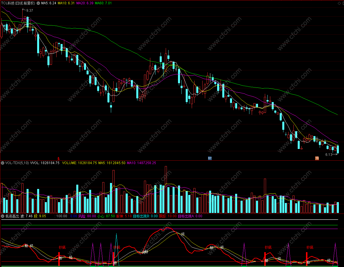 使用说明:红色加粗曲线上穿青色、黄线为买入信号,出现红柱为准备抄底信号。