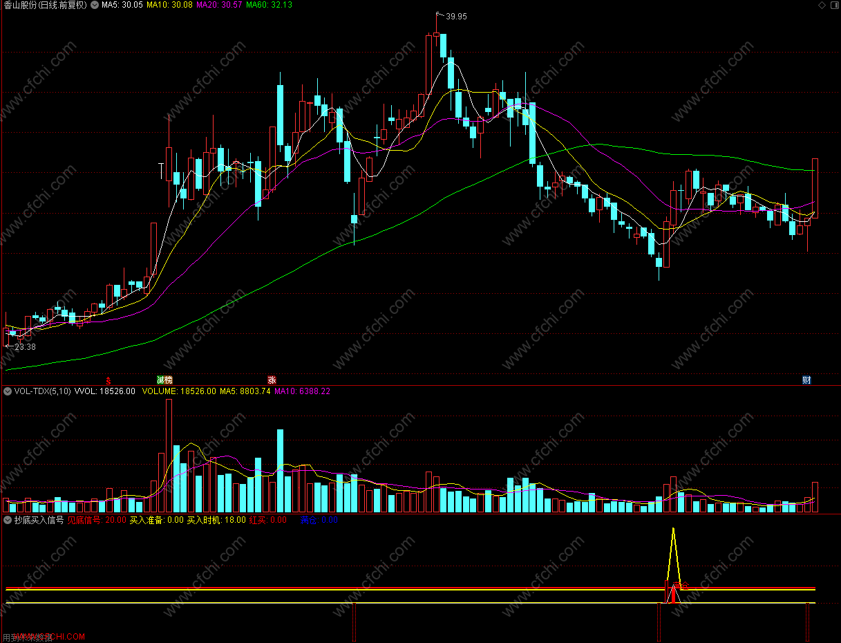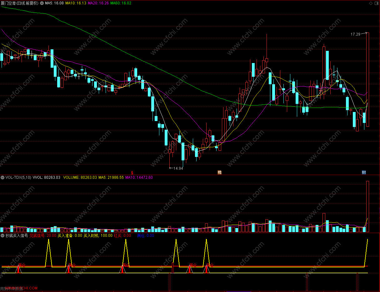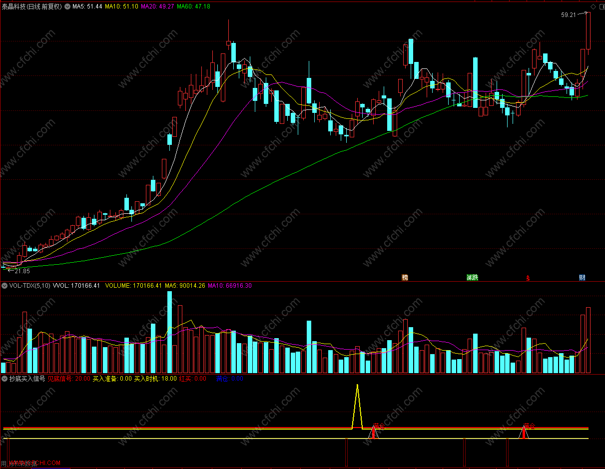 堪称一绝:STICKLINE(REF(TJ,1)=0 AND TJ>=1 AND CCI<-40 ,0,-50,1,-1),COLORRED;DRAWTEXT_FIX(C>O,0.01,0.9,0,' WWW.CFCHI.COM '),COLORRED;