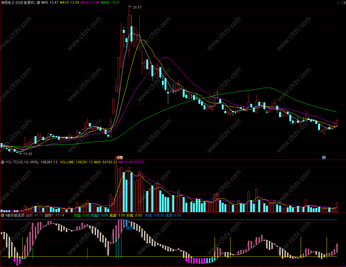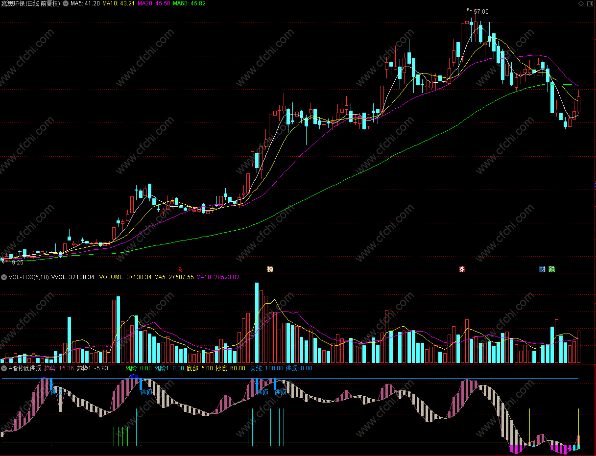 抄底: IF(CROSS(趋势,底部),60,0),LINETHICK1,STICK,COLOR00FFFF;