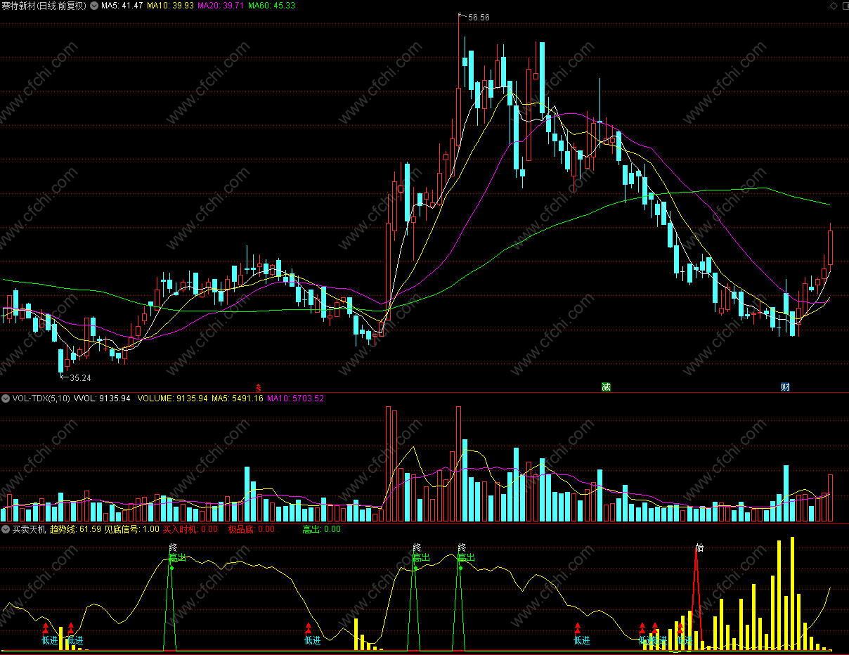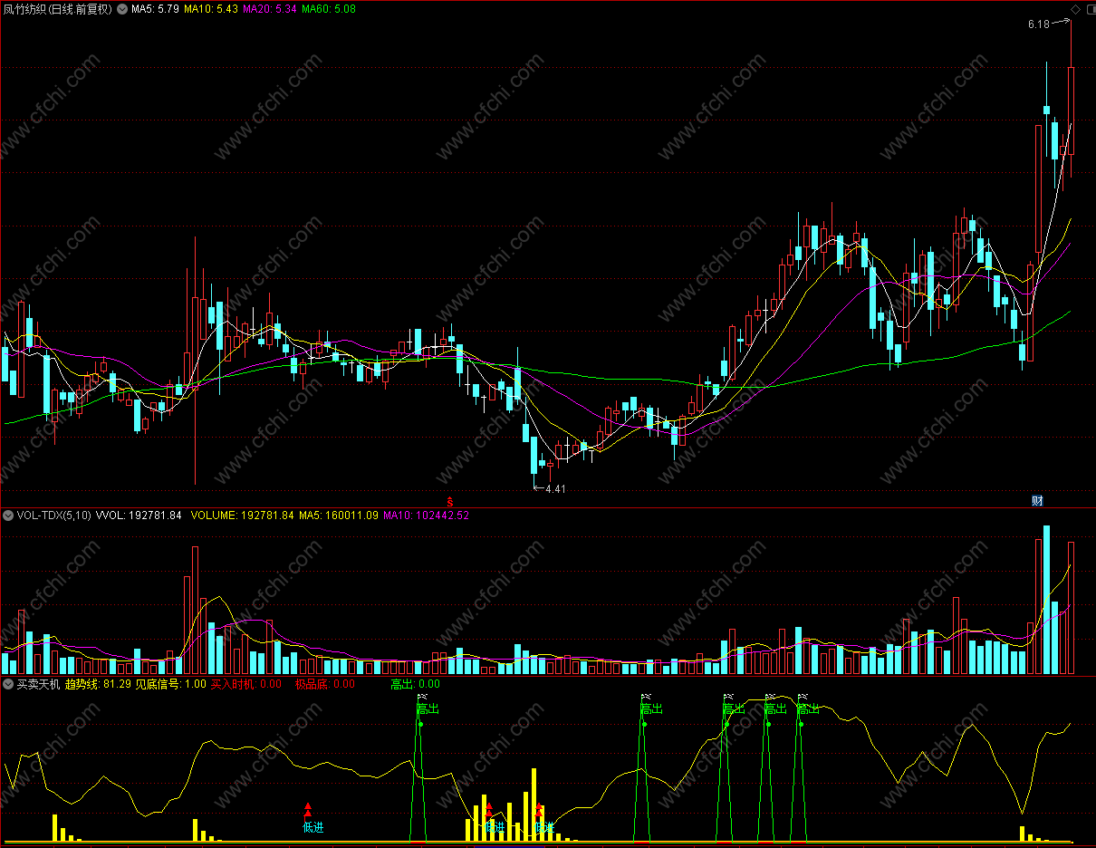 一个某论坛强力推荐的指标,通过计算趋势力度,在图上标示出见底区和见顶区。