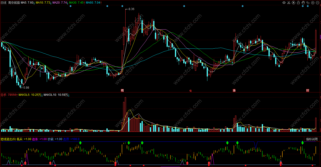 使用说明:出现向上的塔形符号或者箭头,预示后市上涨的概率较大,出现向下的塔形符号或者箭头,预示后市下跌的概率较大。出现两种箭头共振将加大这一上升或者下跌的可能性。