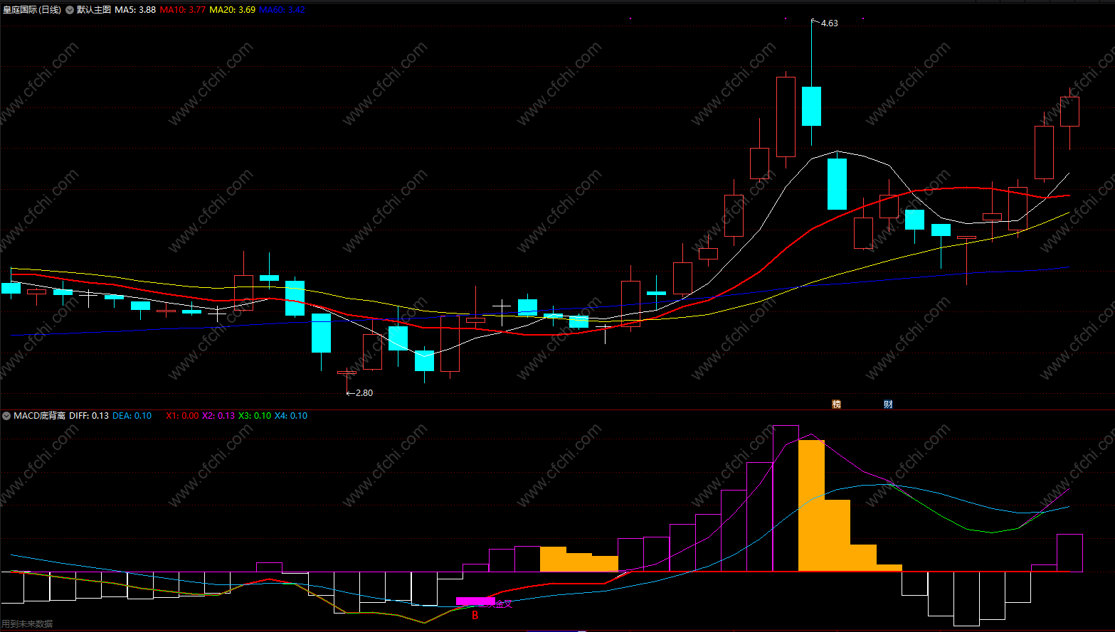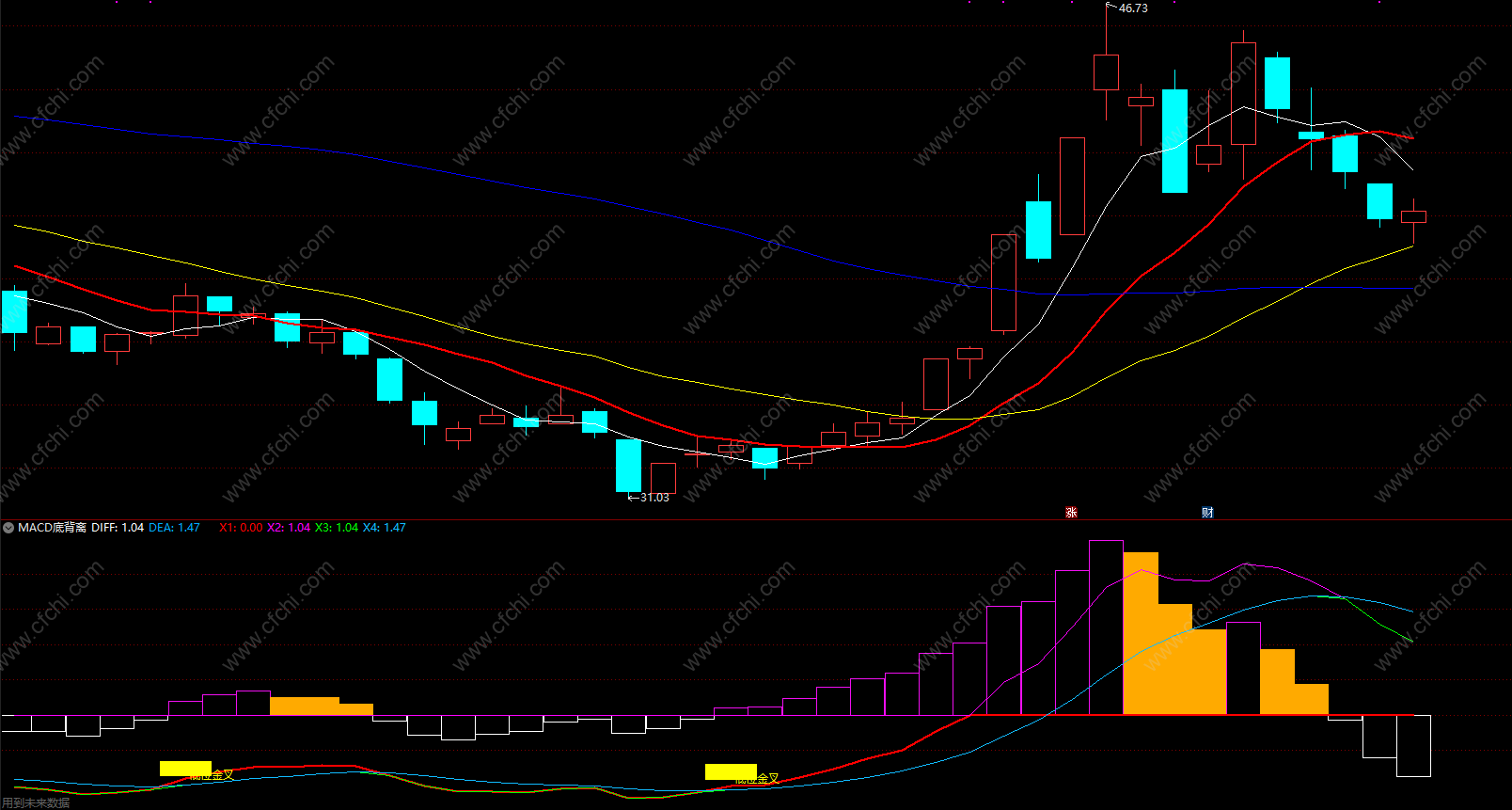 显示macd指标的背离情况,图中用文字表示。为投资交易提供参考依据。
