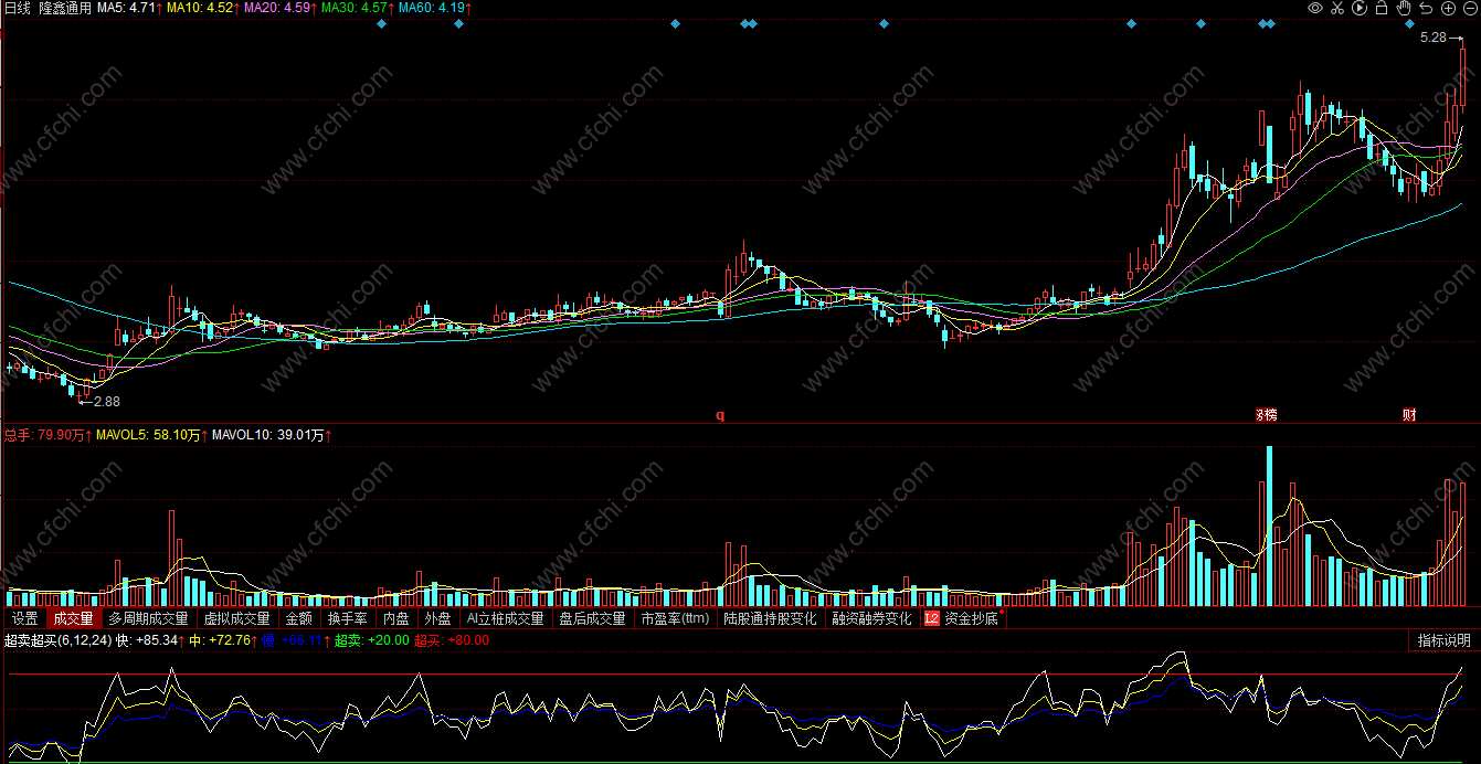 快线下穿绿线超卖(此时可考虑买入),金叉中慢线加仓,上穿红线超买(此时可考虑卖出),死叉中慢线清仓。