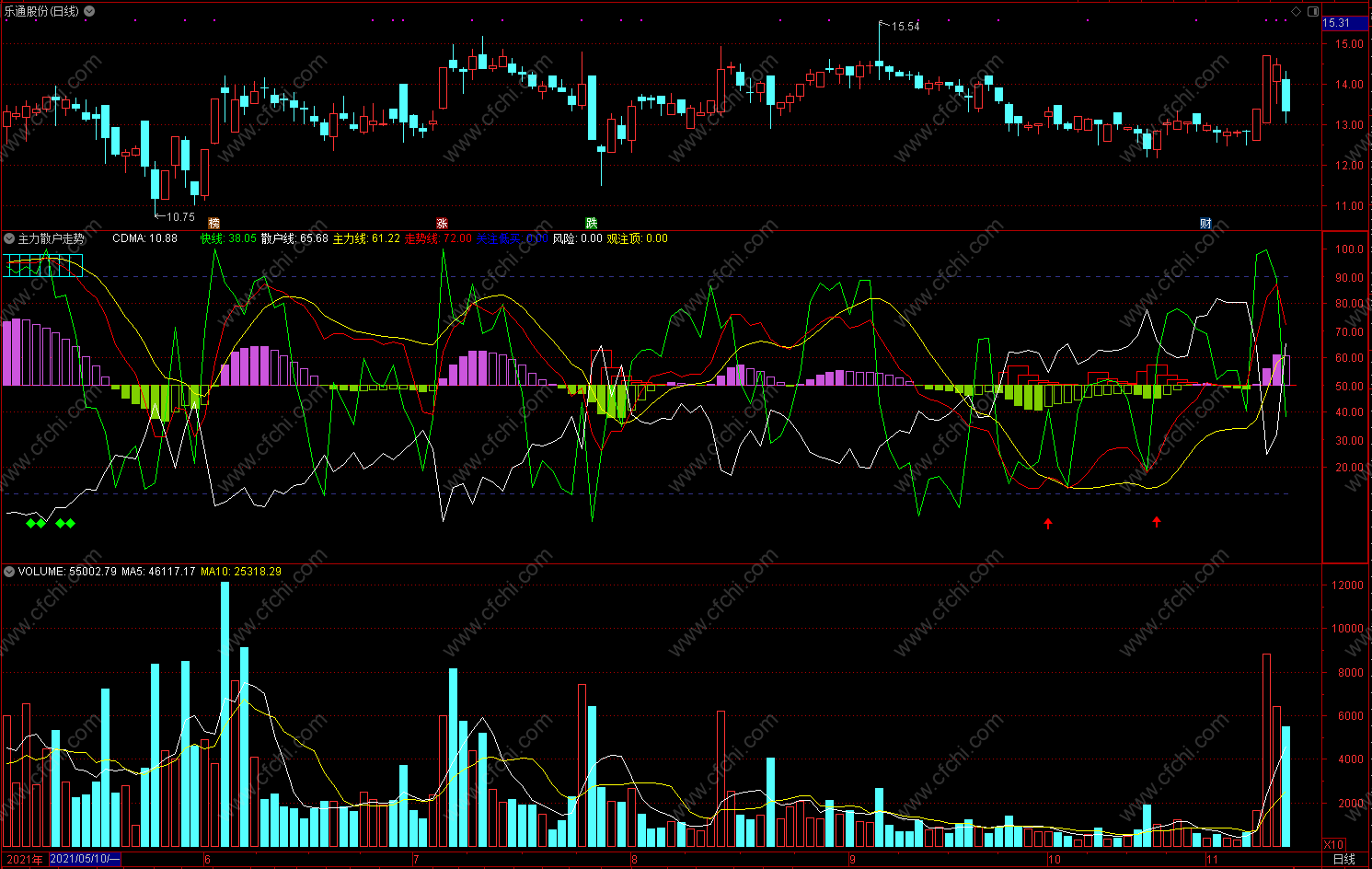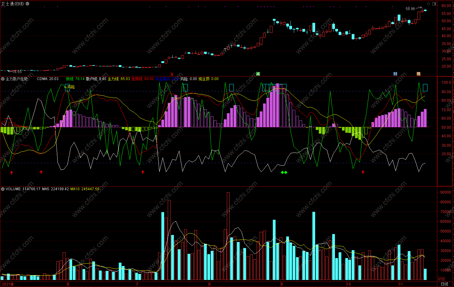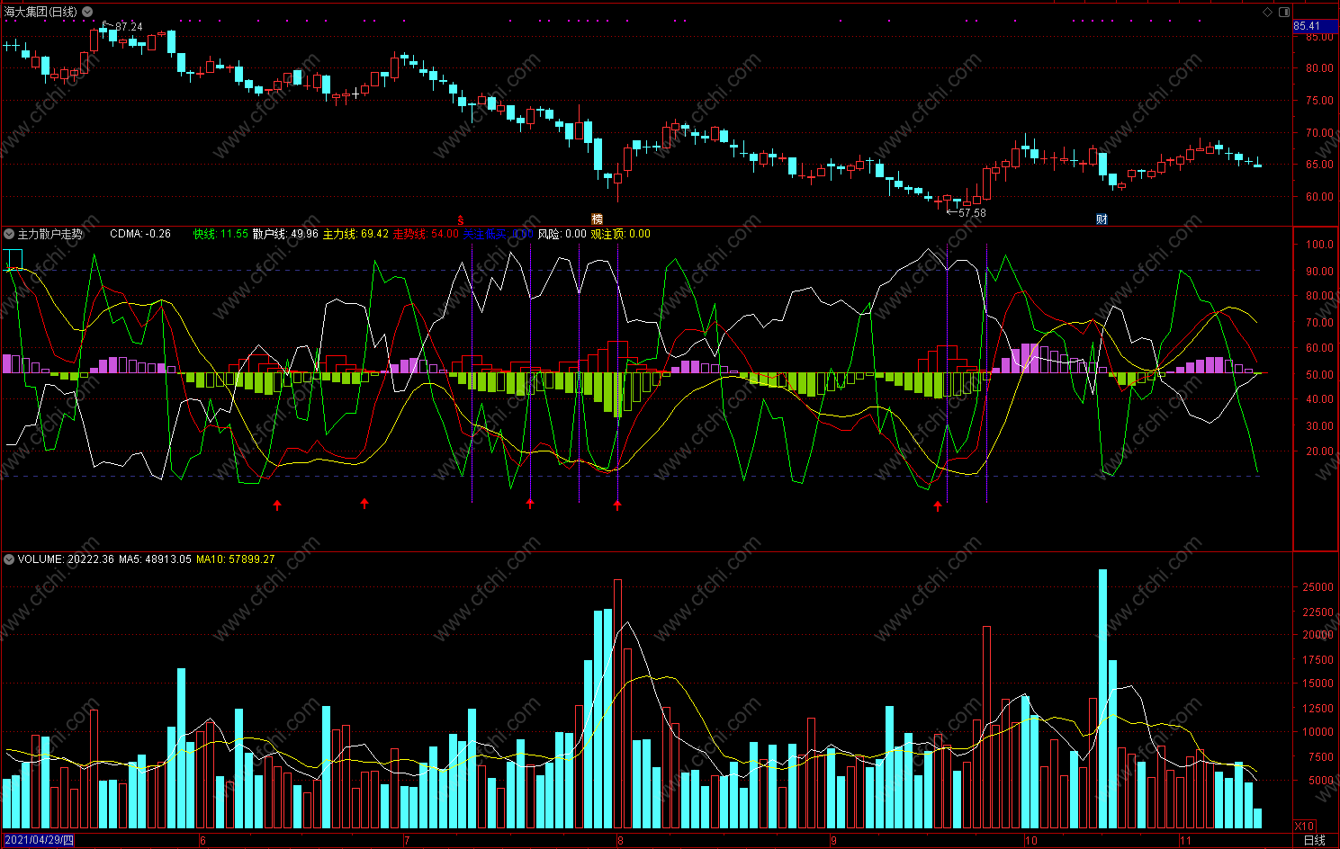 紫色柱子是买入信号,绿色虚线柱子是减仓或卖出信号。
