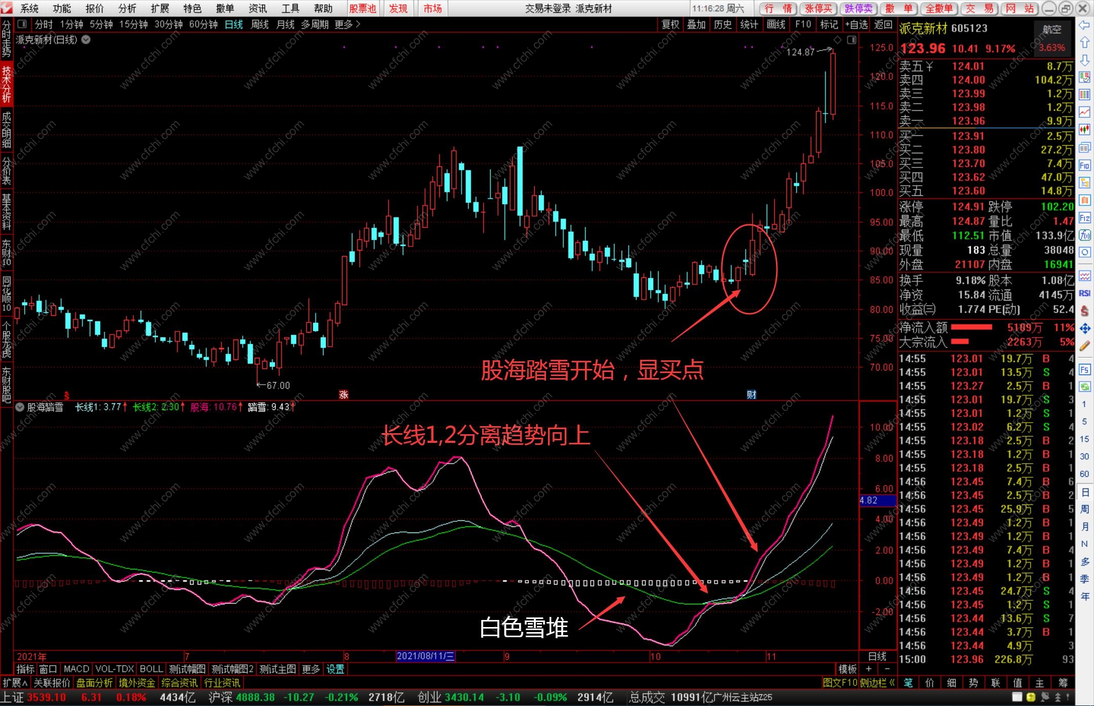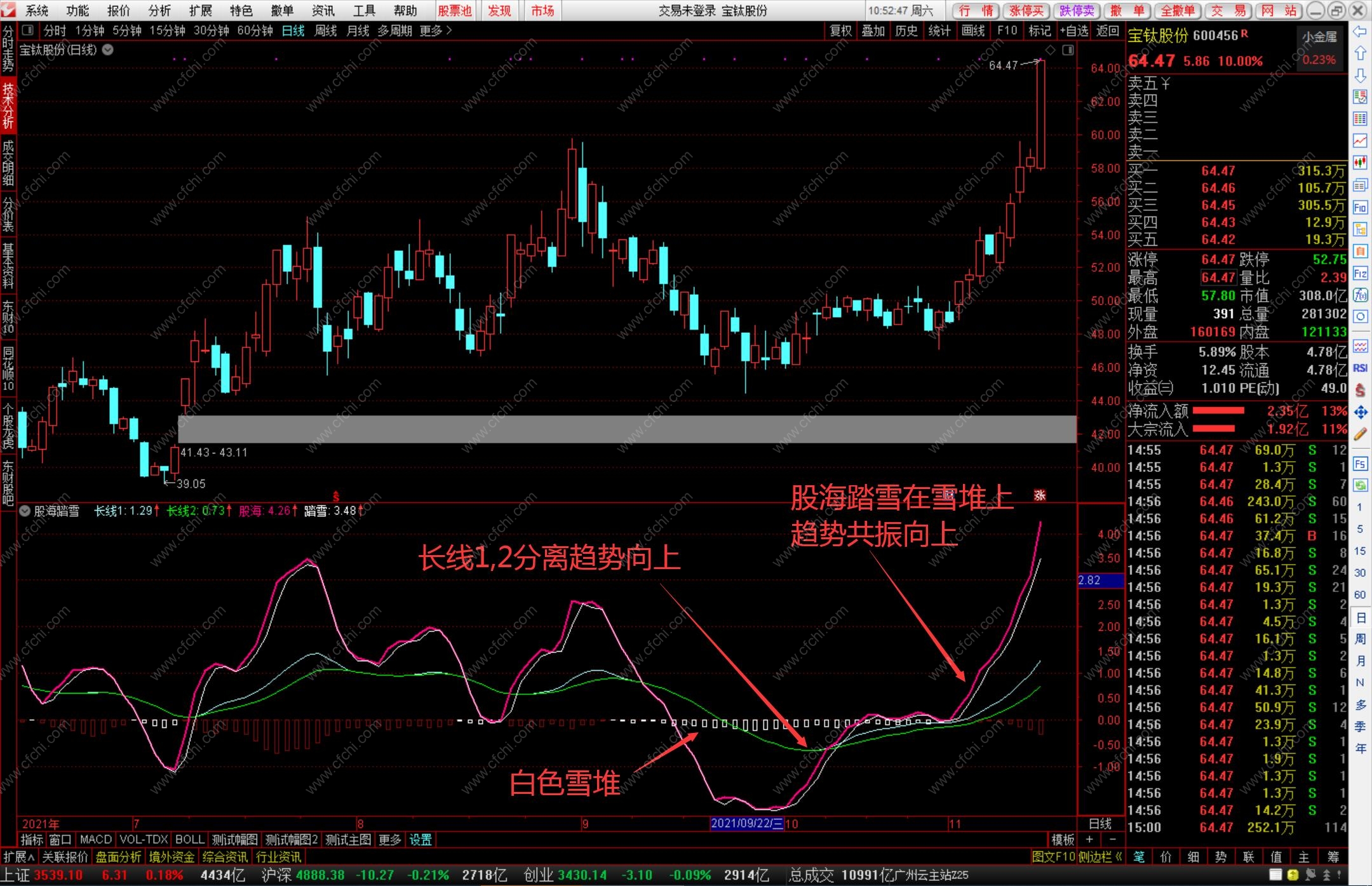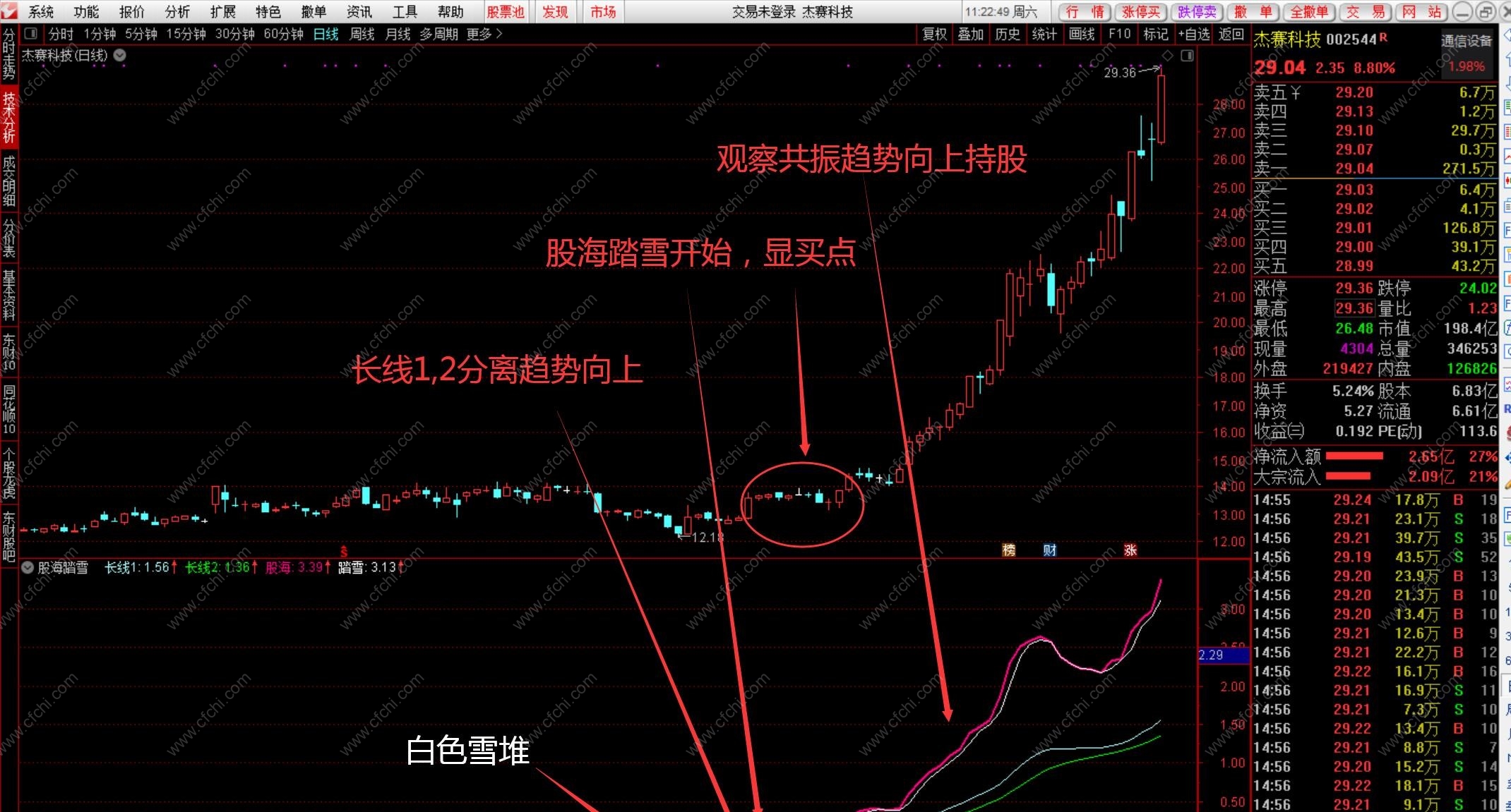 2,观察股海踏雪线,共振向上,开始踏入白色雪堆和长线1,2趋势线上方,显波段起涨买点