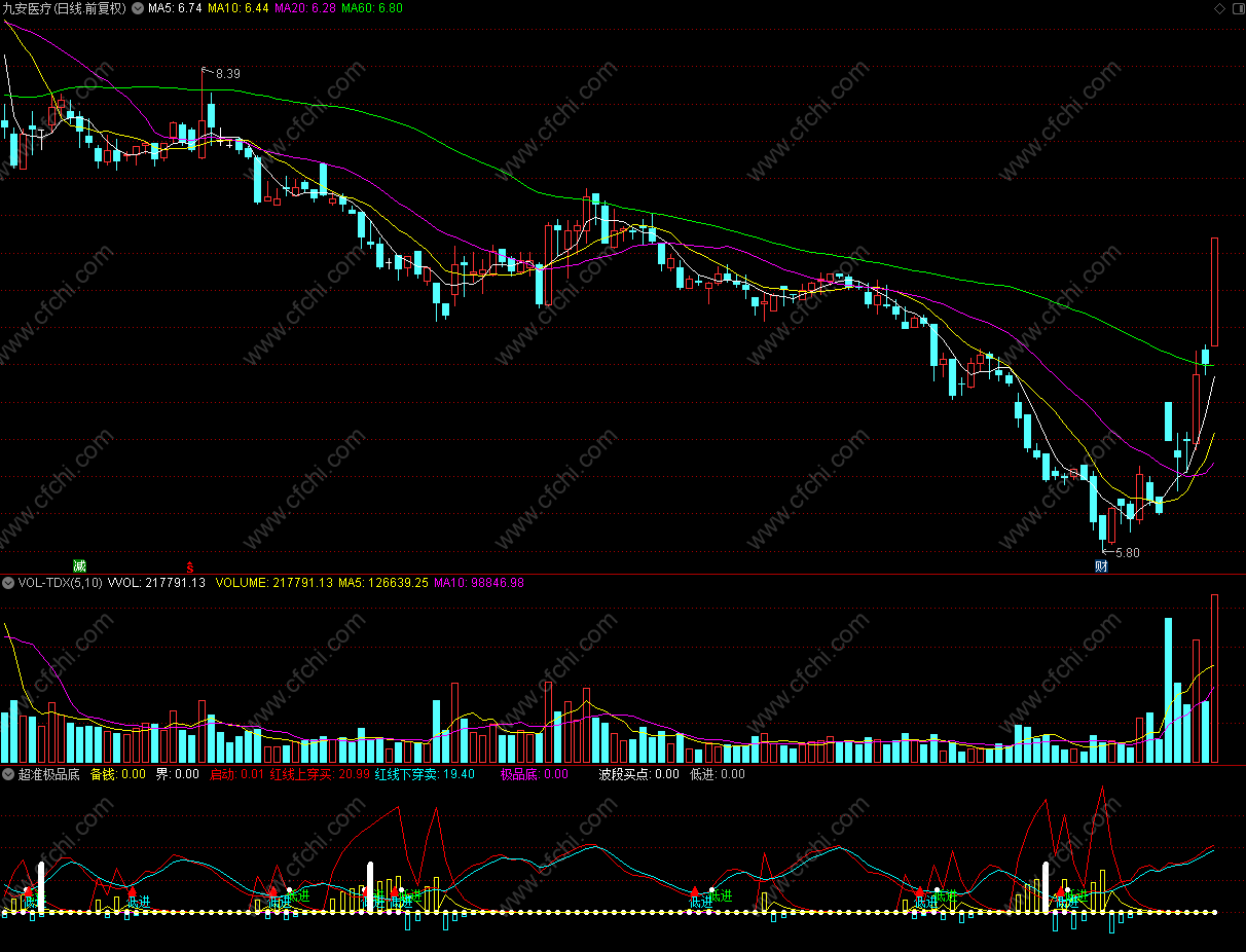 极品底:IF((MA(C,5)-C)/C>0.04 AND (MA(C,10)-MA(C,5))/MA(C,5)>0.04,23,0),LINETHICK1,COLORFF00FF;