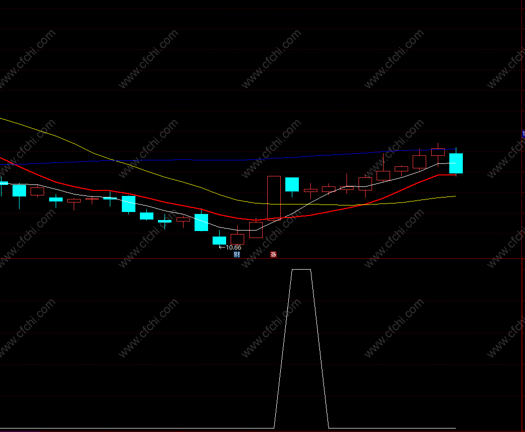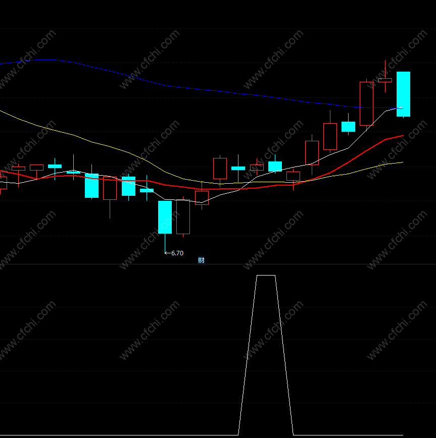 图中所示副图指标中,凸起了一个尖尖的线条,这就是短线绝佳买入点指标,预示着这个股票上涨的趋