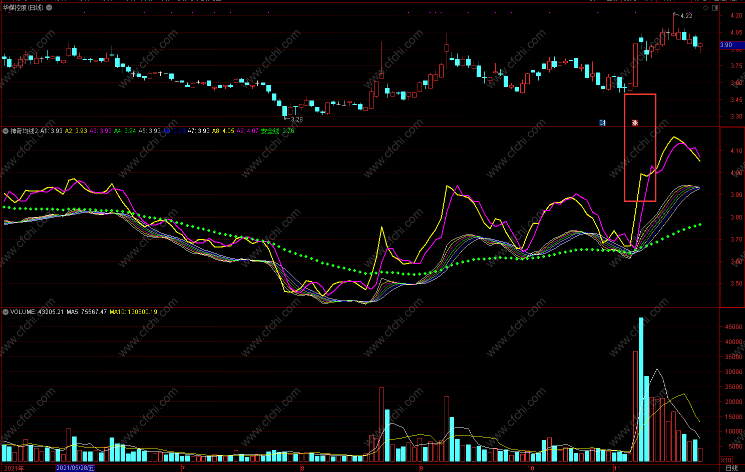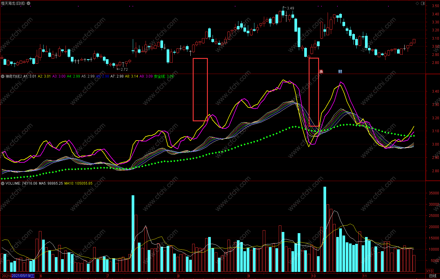 红色点状线为长期走势 通达信神奇均线2指标公式 副图 无未来