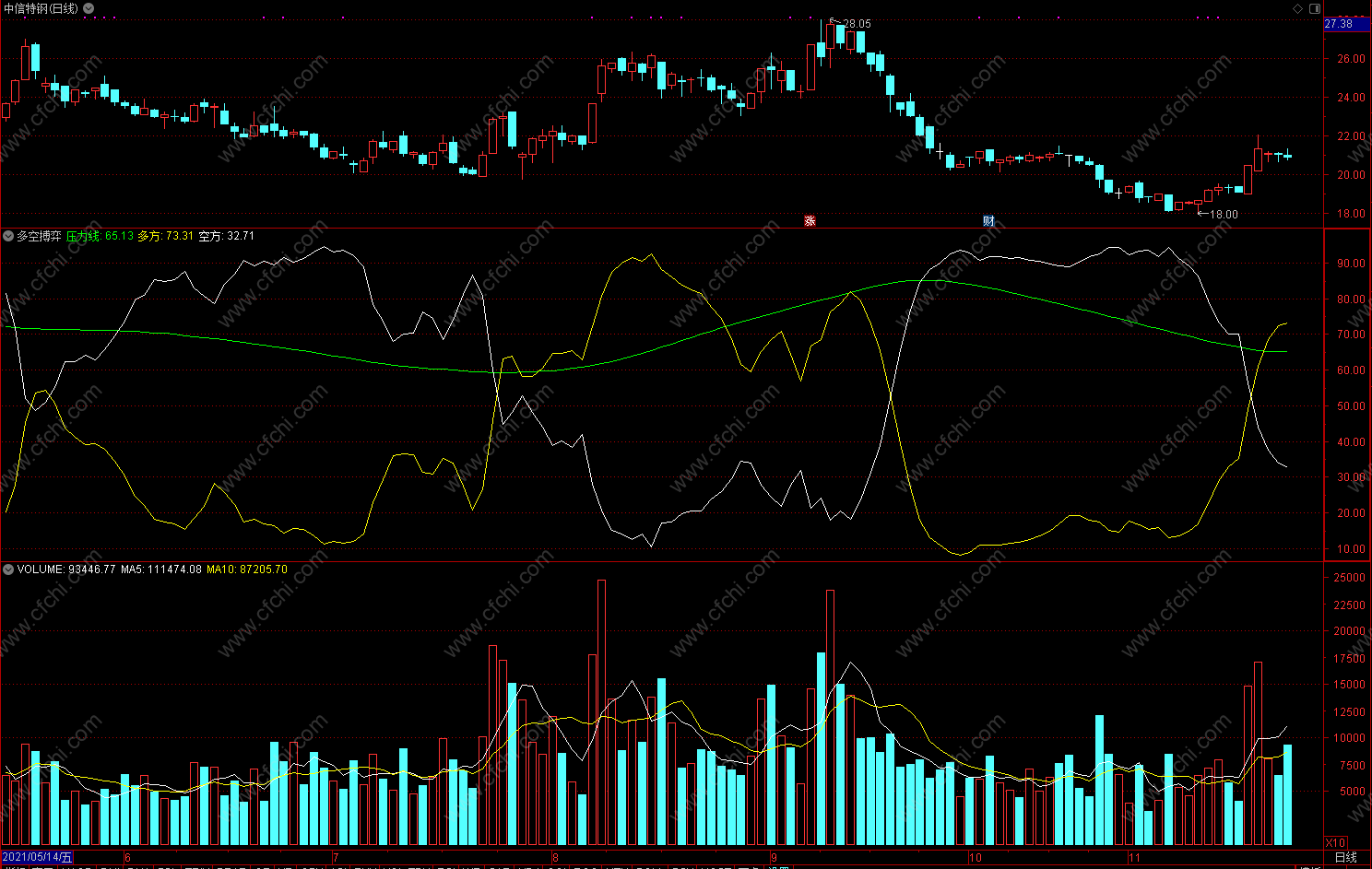 黄线上穿白线关注,绿色线为压力线,黄线在绿线拐头为波段头部回避。