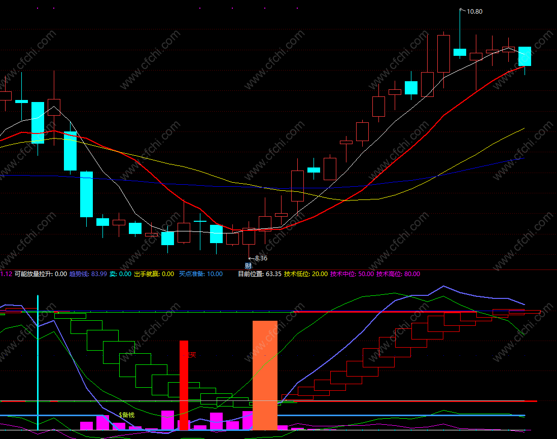 1、文字提示“备钱”有粉色、橙色柱子时上涨趋势,红色波段上涨趋势。