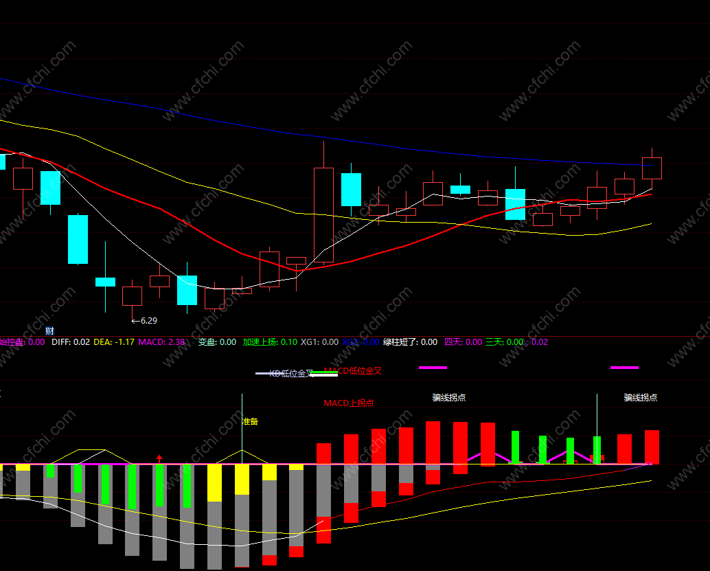 DRAWTEXT(FILTER(CROSS(DIFFF,DEAF) AND DEAF<0,6),L-0.02,'MACD低位金叉'),COLORRED;