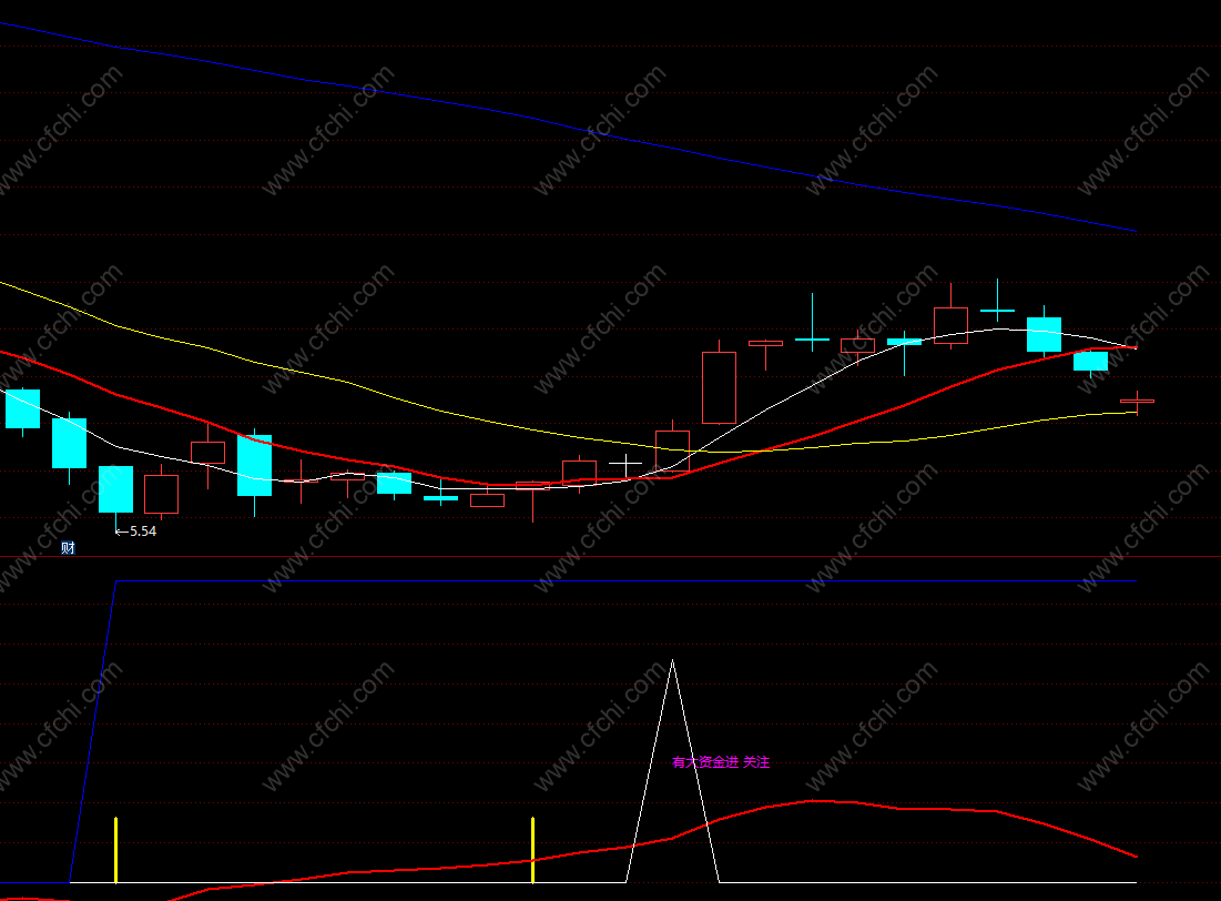 资金进场日:IF(A11>0,8,DRAWNULL),COLOR00FFFF,LINETHICK3,STICK;