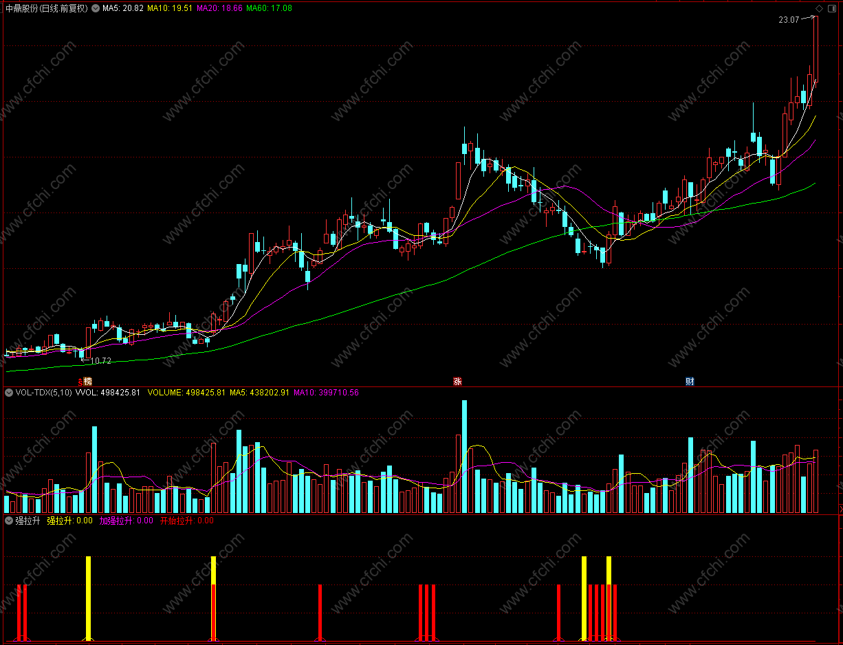 开始拉升:STICKLINE(地>天 AND 地<0,10,0,1,0)=1,COLORRED;