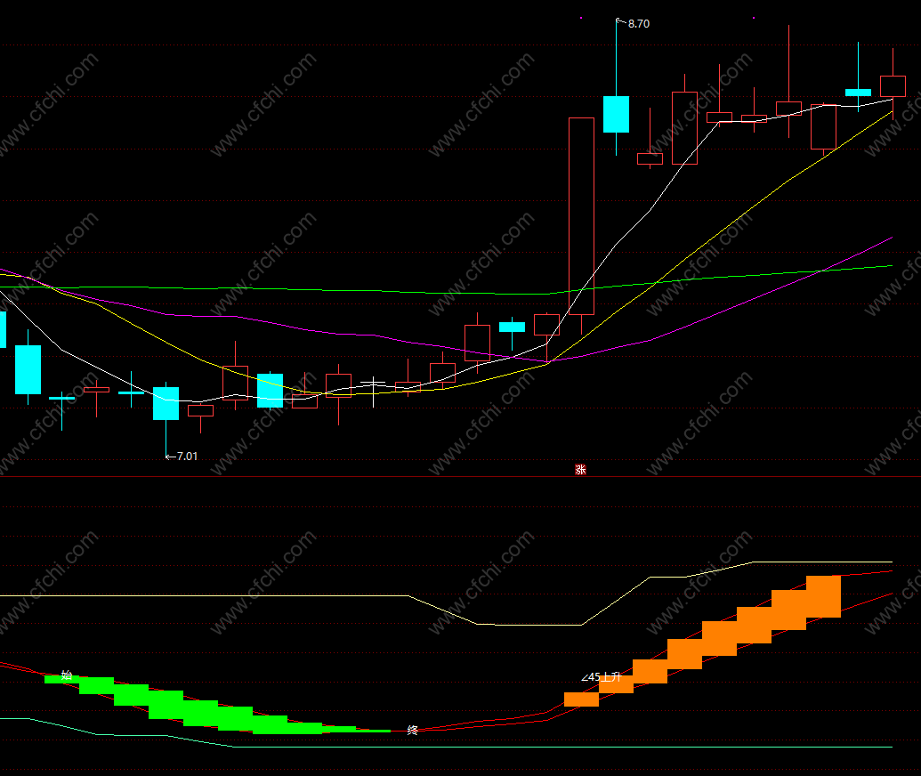 EMA8,'∠45上升'),COLORWHITE;压力:MA(REF(HHV(C,30),1),2),COLOR9DFFFF;