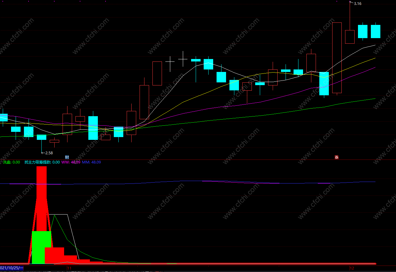 当有大的白线出现时,机会出现,可以准备买进。红线为主力进场建仓。洗筹的时间为16-18天,可能边洗边拉,或者洗筹过程中没有拉升,那洗筹完后马上会拉升。