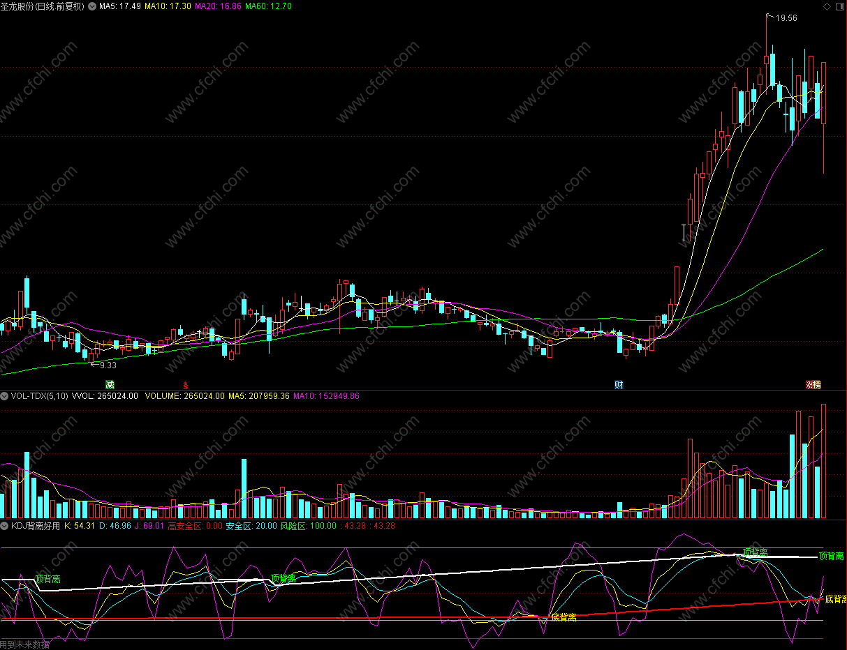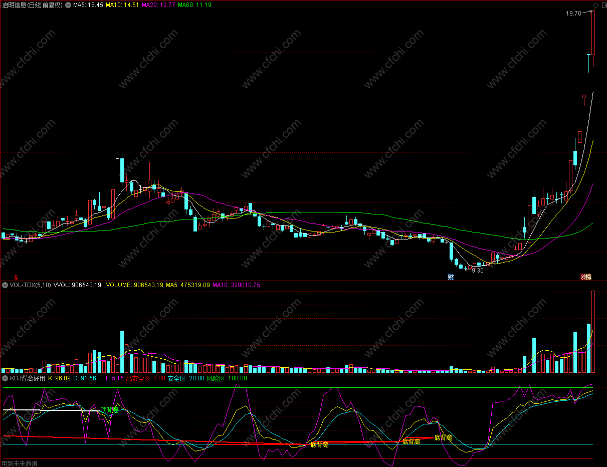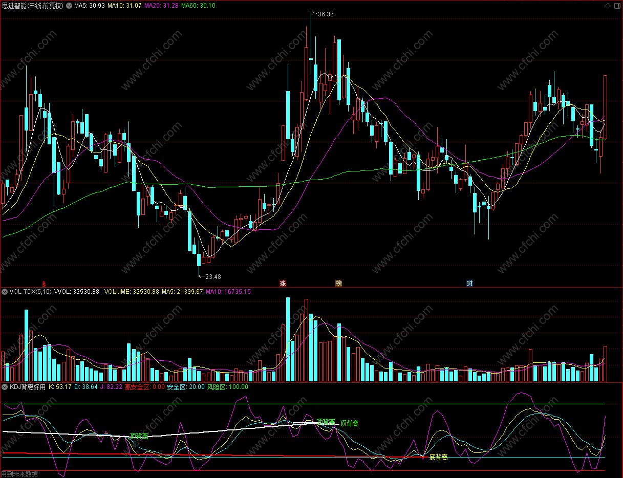 自用指标看到坛子里面KDJ背离指标不多上传的低于20高于80是超卖超卖区 和系统KDJ一样只是系统到20和80时候J自然钝化 这个是上去一点要是习惯系统KDJ可以只看到20和80线那里就一样了 有背离提示 使用时候还可以的!