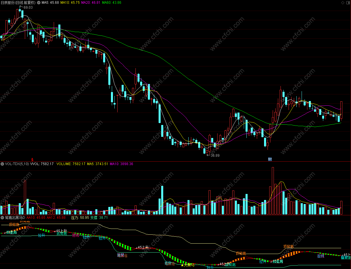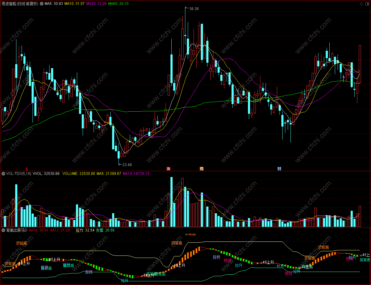 EMA8,'∠45上升'),COLORWHITE;压力:MA(REF(HHV(C,30),1),2),COLOR9DFFFF;