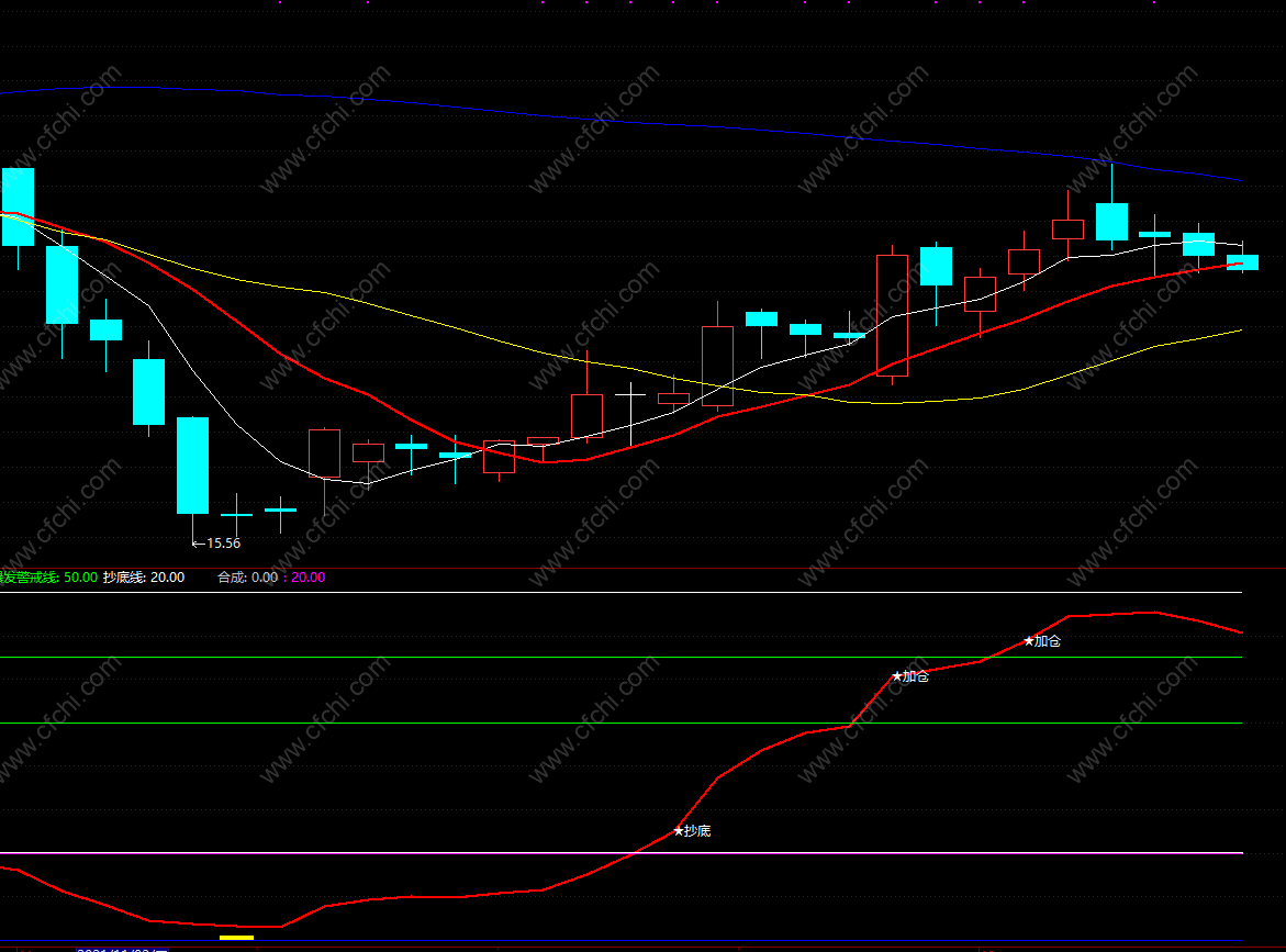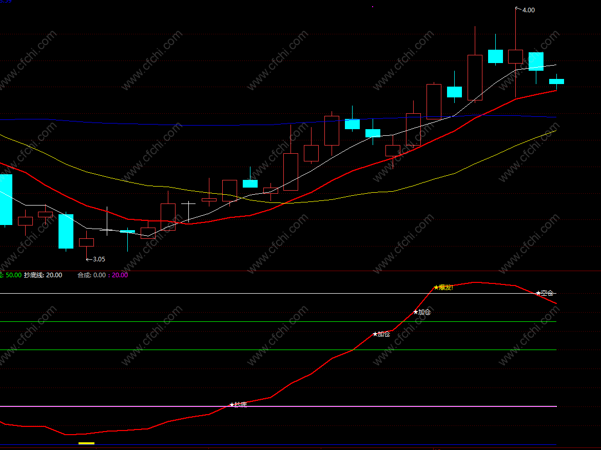 DRAWTEXT(CROSS(主力资金,爆发警戒线),主力资金,'★加仓') ,COLORWHITE;