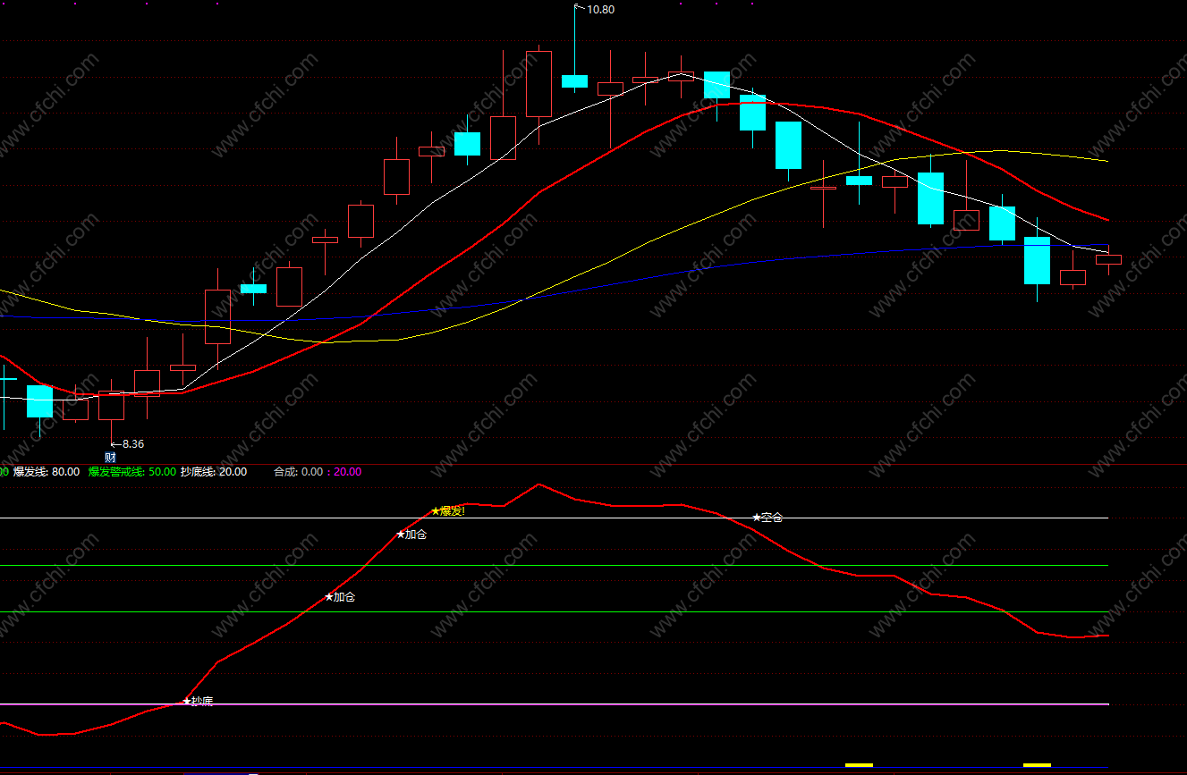 DRAWTEXT(CROSS(爆发线,主力资金),爆发线,'★空仓') ,COLORWHITE;