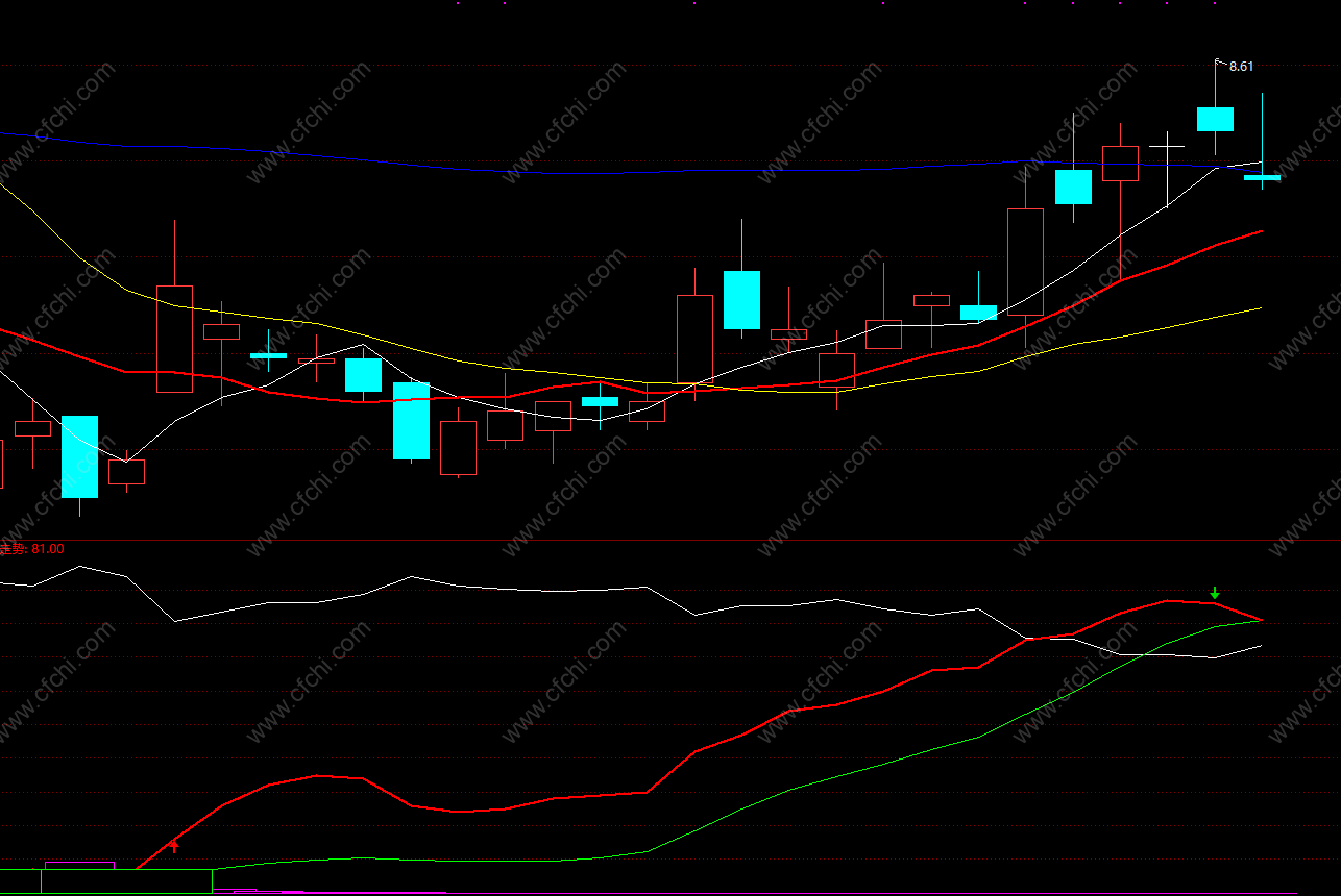 主力进出指标的绿线向上突破黄线、白线且三线向上发散,表示主力有效控盘,可关注或持股待涨。主力进出指标的绿线上涨过快远离黄、白线,出现较大乖离,表示短线获利筹码较多,宜注意控制风险,可考虑适当卖出。当绿线回落至黄、白线处受支撑时,而黄白线发散向上,表示上升趋势未改,前期股价回落仅是途中的回调,可考虑适量跟进。主力进出三线"死亡交叉",盘口呈空头排列,则可能存在较大风险。主力进出三线相近并平行向下时,表明主力尚未进场或正在出货,此时不宜介入。