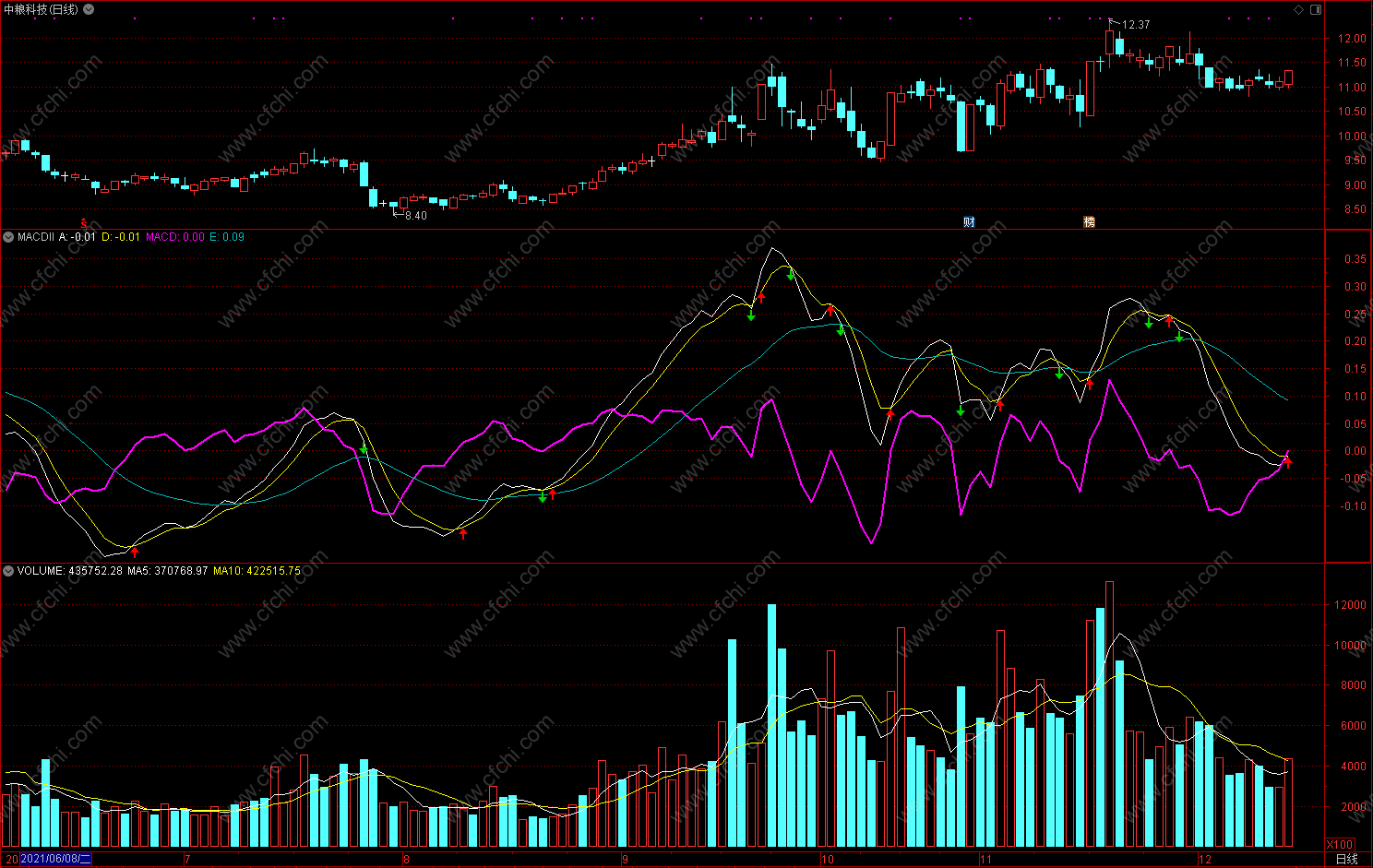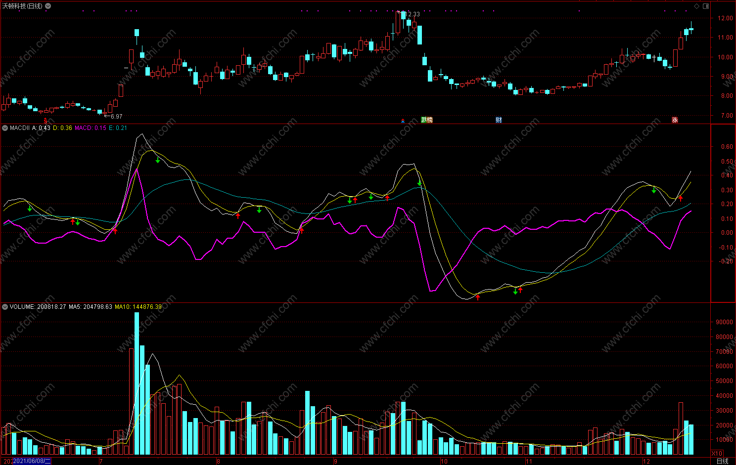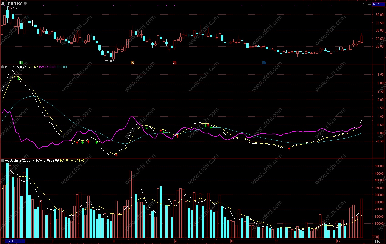 4.分析MACD柱状线,由红变绿(正变负),卖出信号参考;由绿变红,买入信号参考。