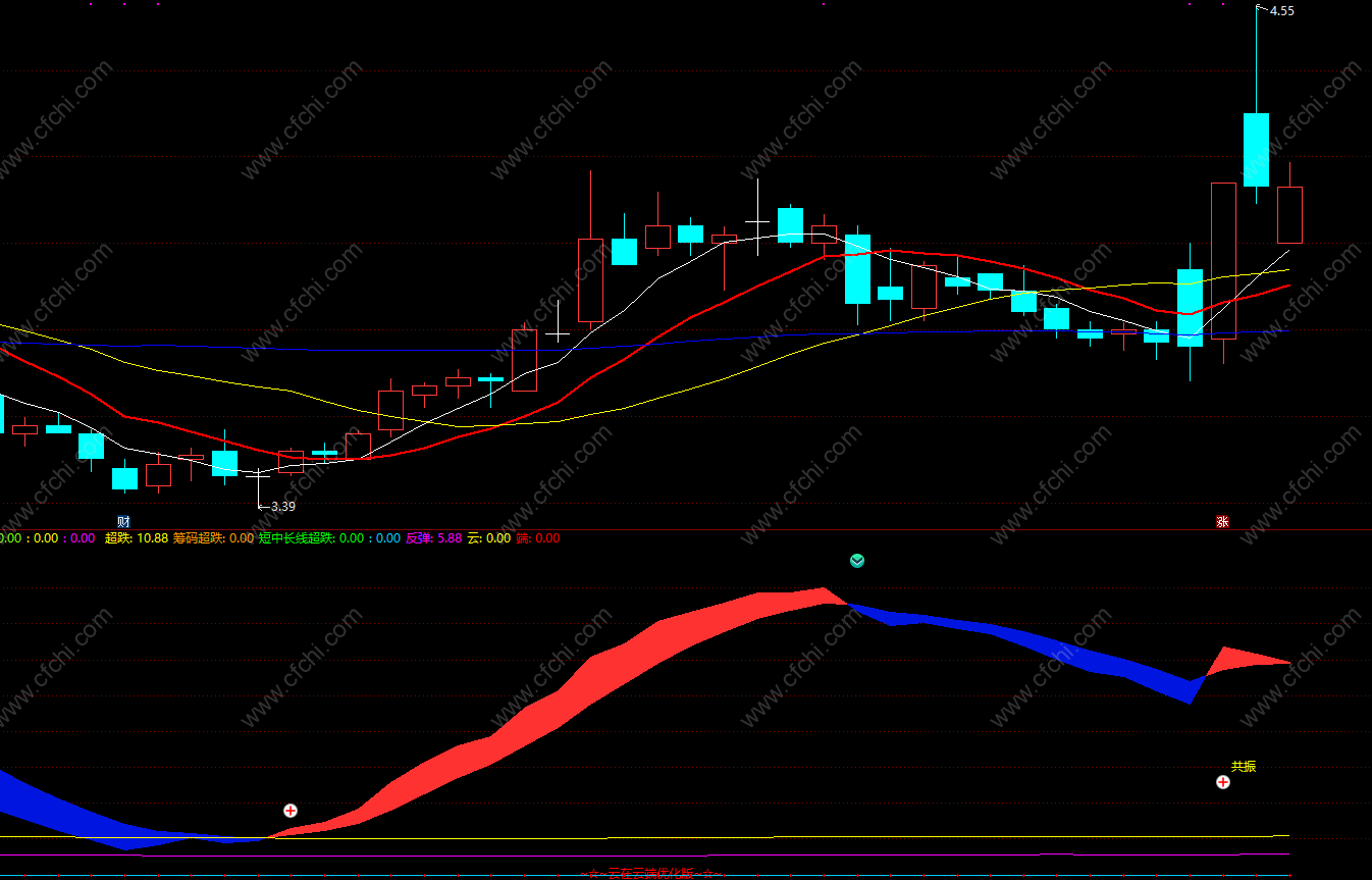 DRAWTEXT(CROSS(VAR44,VAR55) AND CROSS(KK,DD),30,' 共振'),COLOR00FFFF;