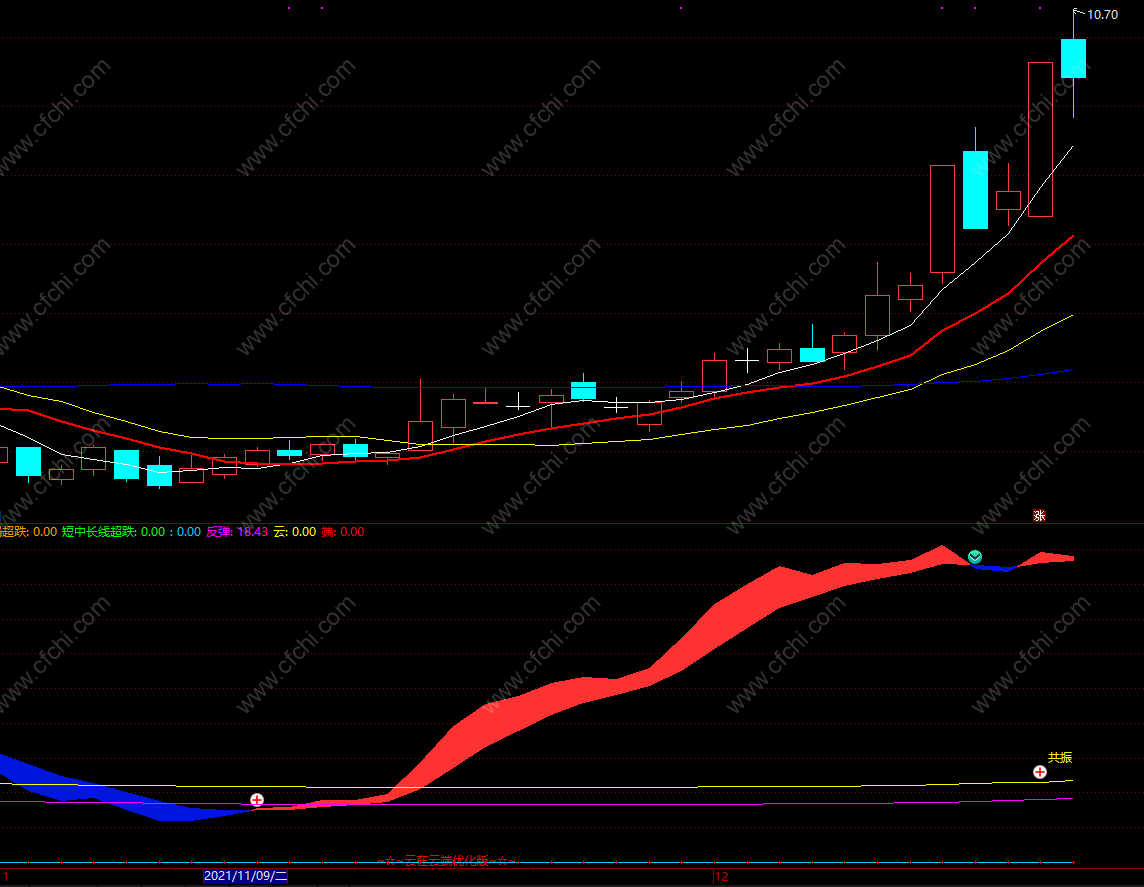 云:IF(超跌=反弹 AND CYS13<=-10 AND 筹码超跌=30,-30,0),coloryellow,STICK,LINETHICK3;