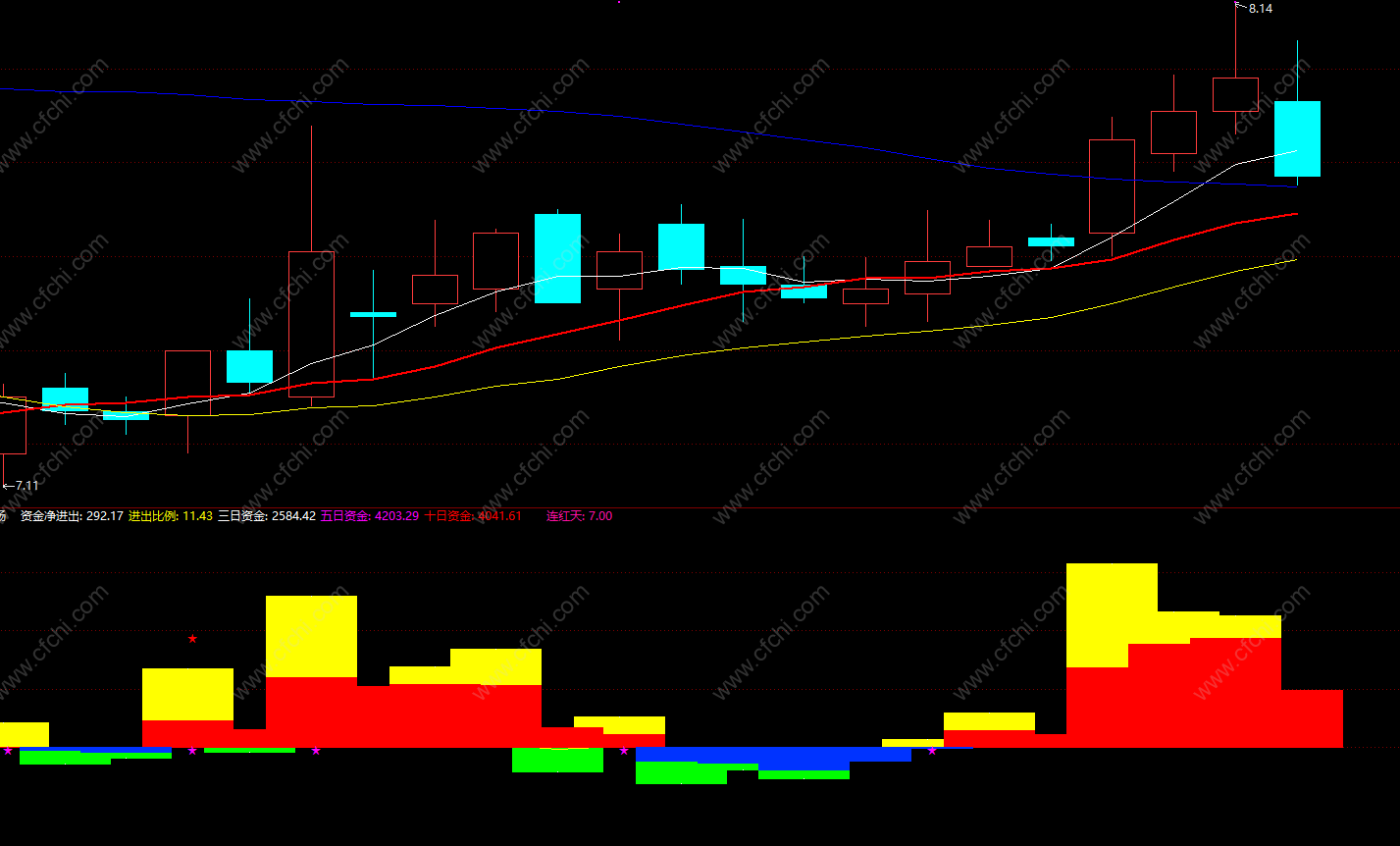 黄柱初出蓝:=REF(资金流出,1)<0 AND 资金流入>30 AND C>O AND C>REF(C,1) AND C>MA(C,3);