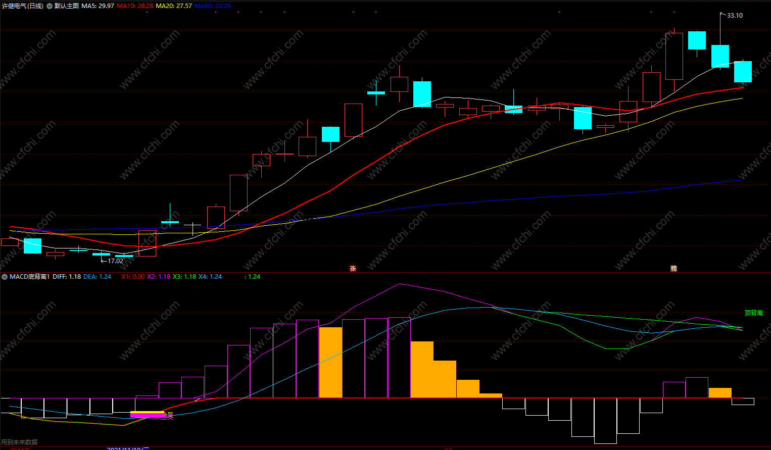 顶背离:=REF(CLOSE,A2+1)<CLOSE AND REF(DIFF,A2+1)>DIFF AND CROSS(DEA,DIFF);