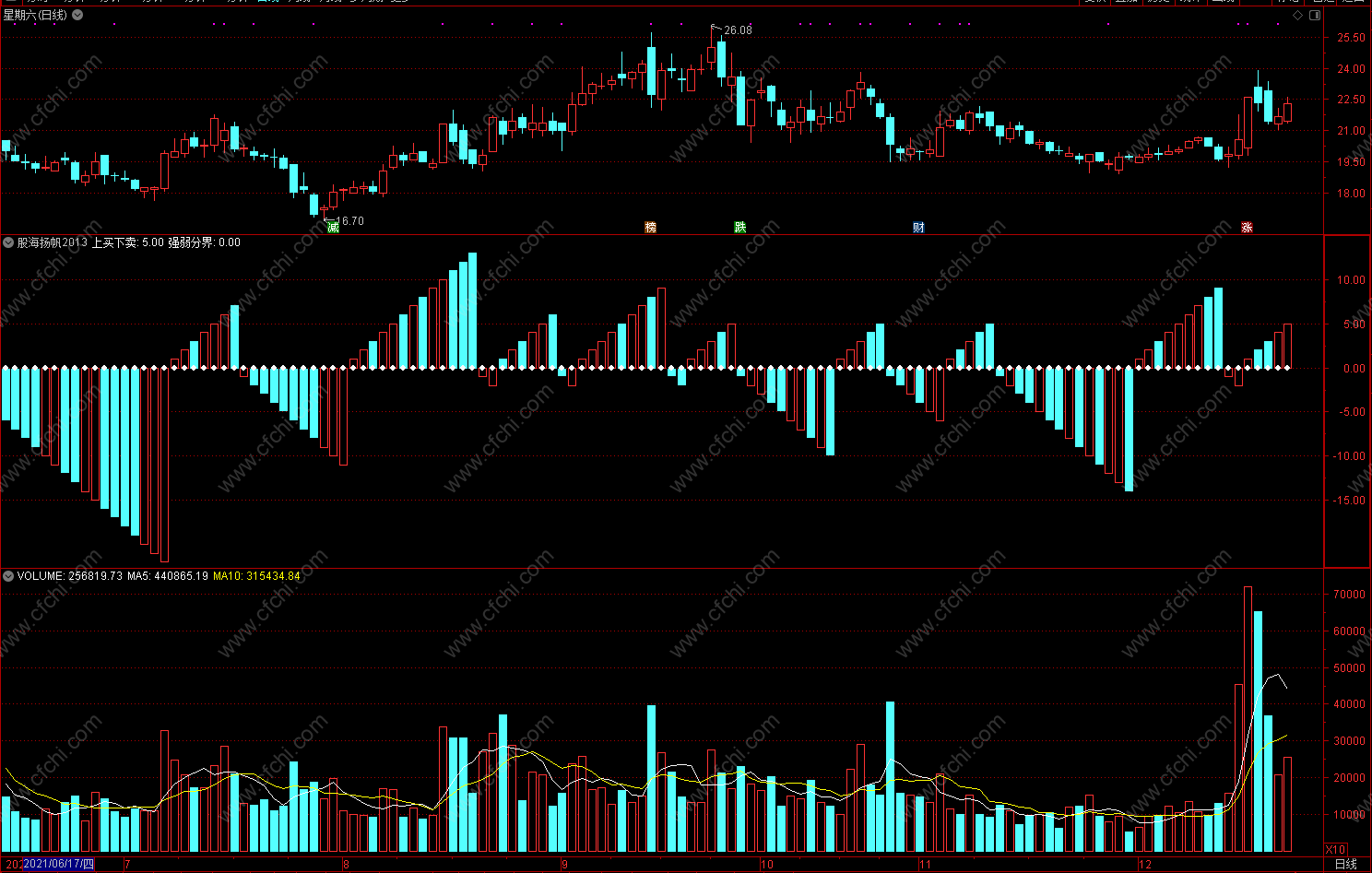 “股海航帆”指标由红、绿两色柱线和“强弱分界”线构成,形似风帆,股市是涨是跌,一目了然。