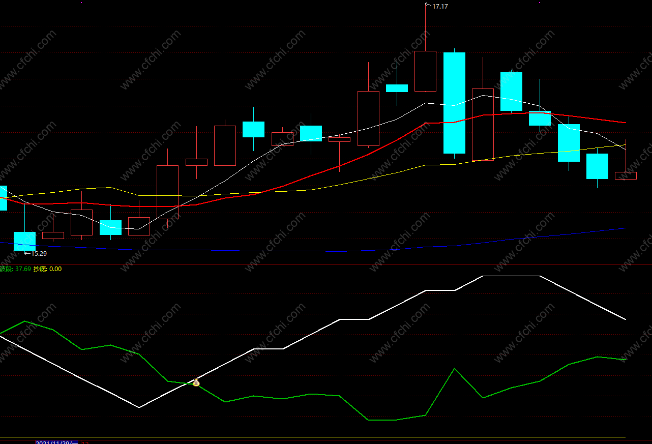老介波段:(HHV(HIGH,63)-CLOSE)/(HHV(HIGH,63)-LLV(LOW,63))*100,COLOR00BB00,LINETHICK2;