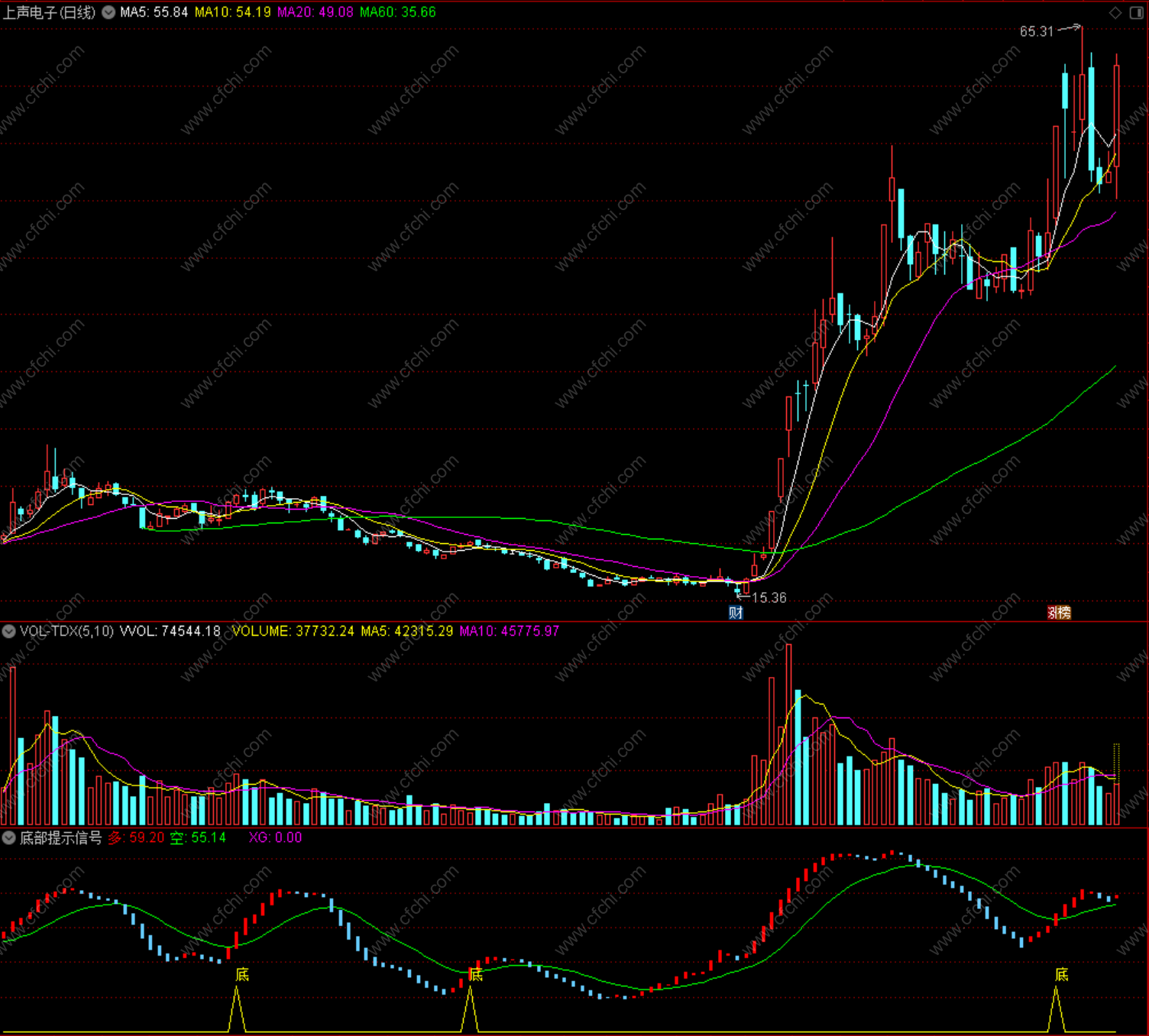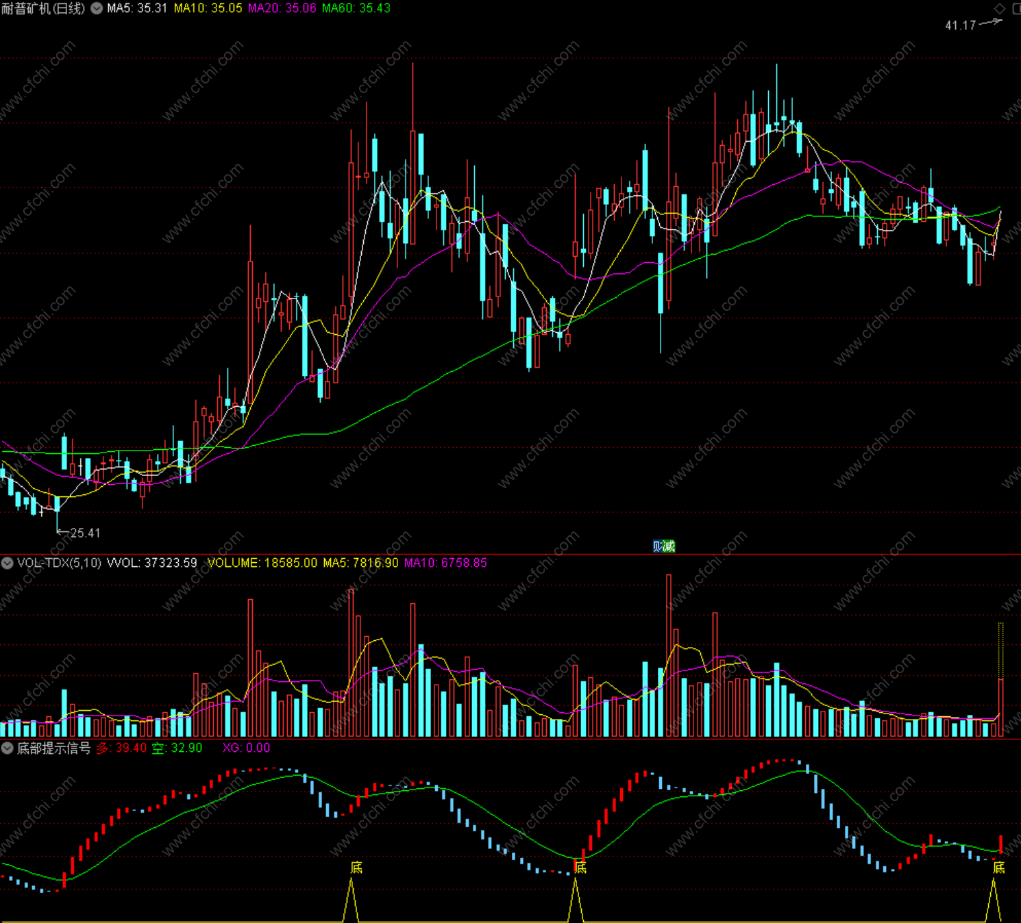 发出“底”信号后,同时由蒌柱变红柱形成共振最好。均线不要粘合最好。适合做波段底部。