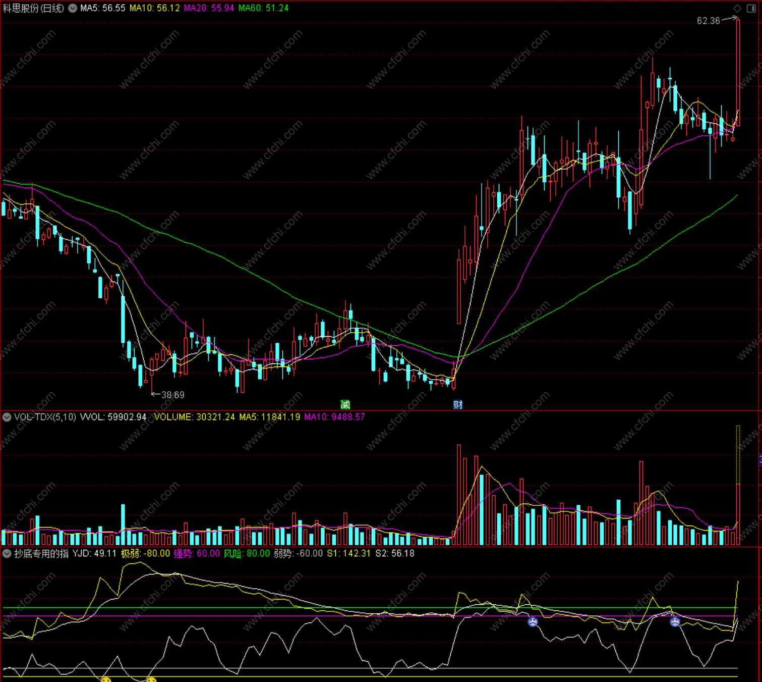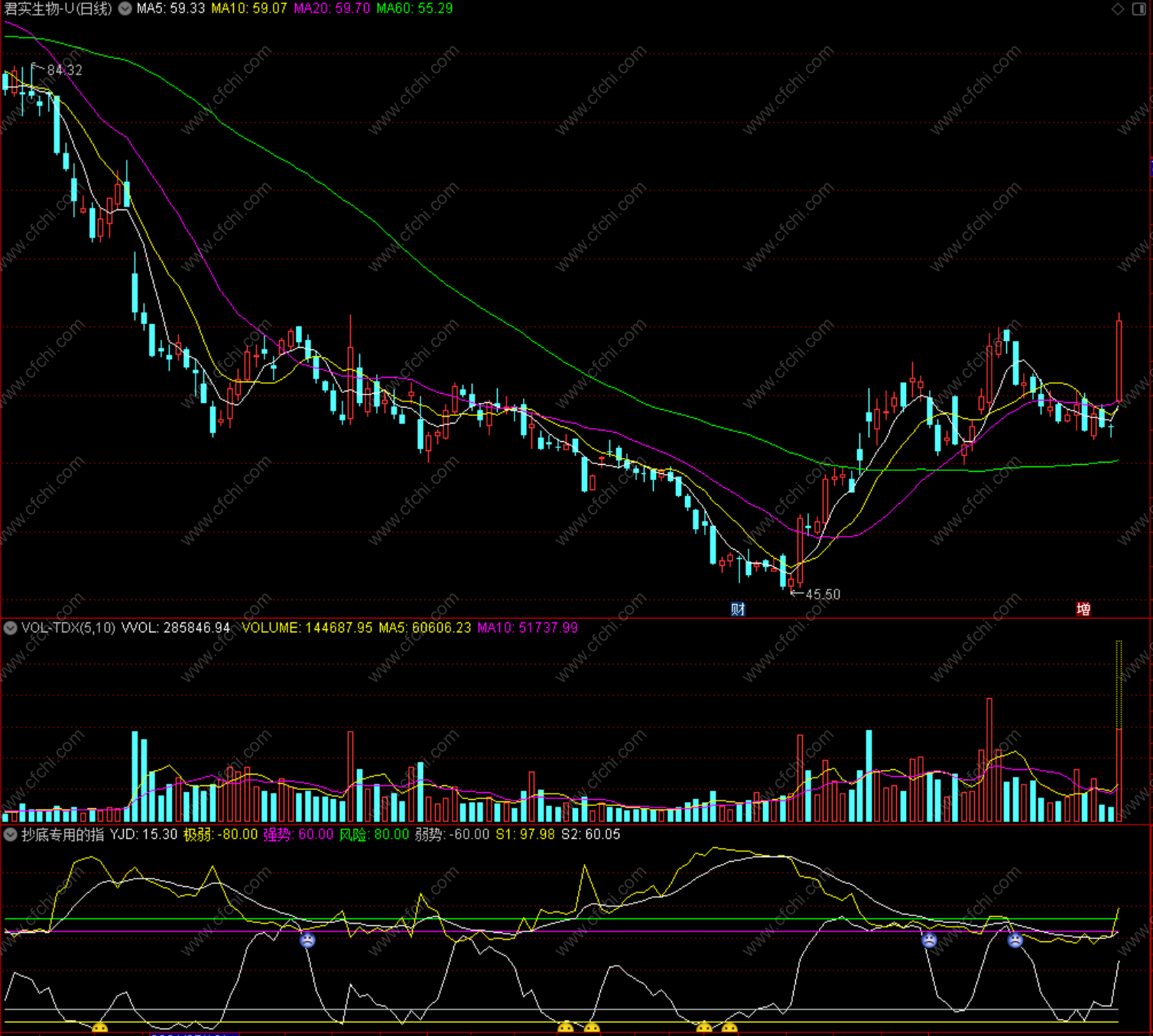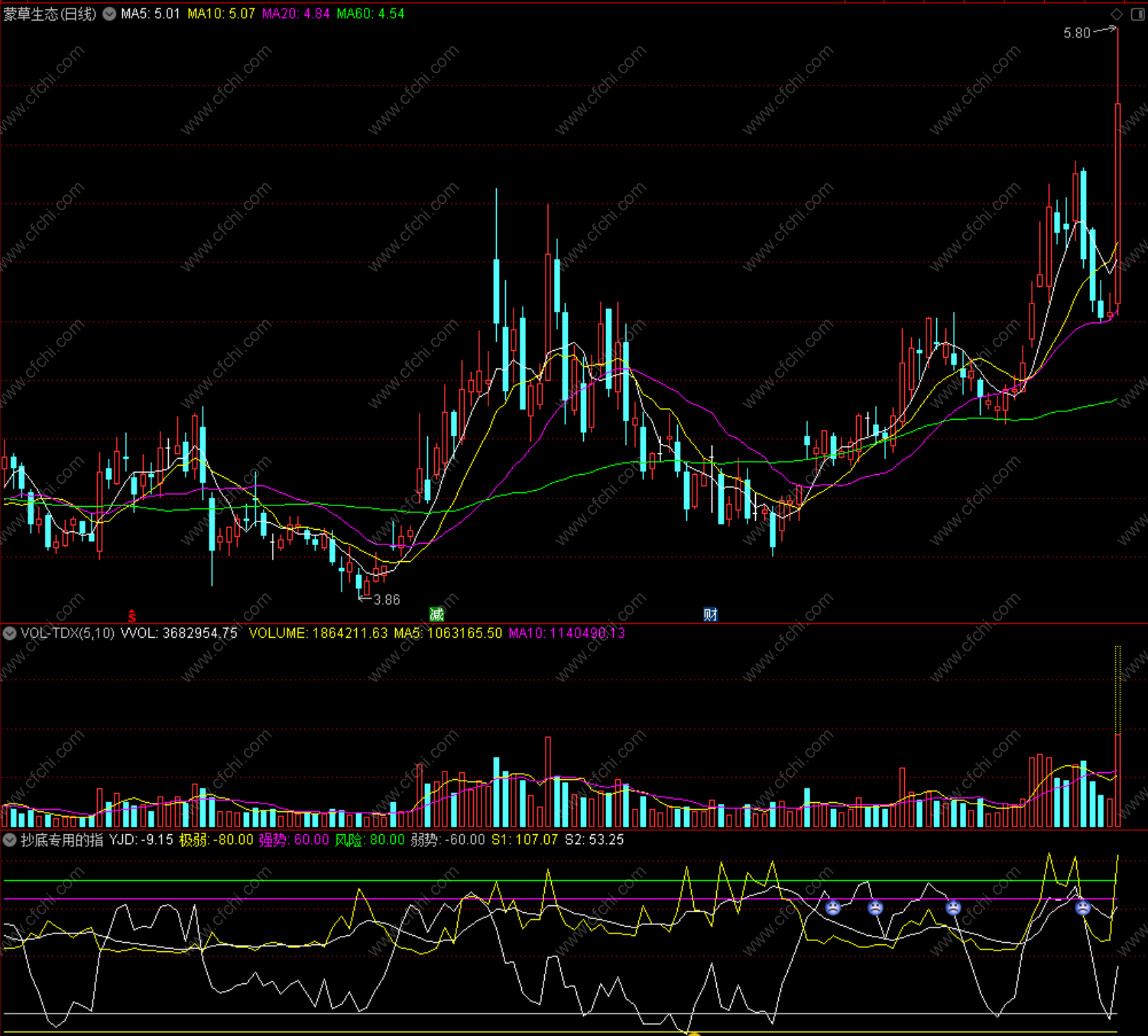 这是一个用于抄底的指标,该指标在个股接近底部时会发出抄底信号。多说无益,看该指标的用法,和介绍