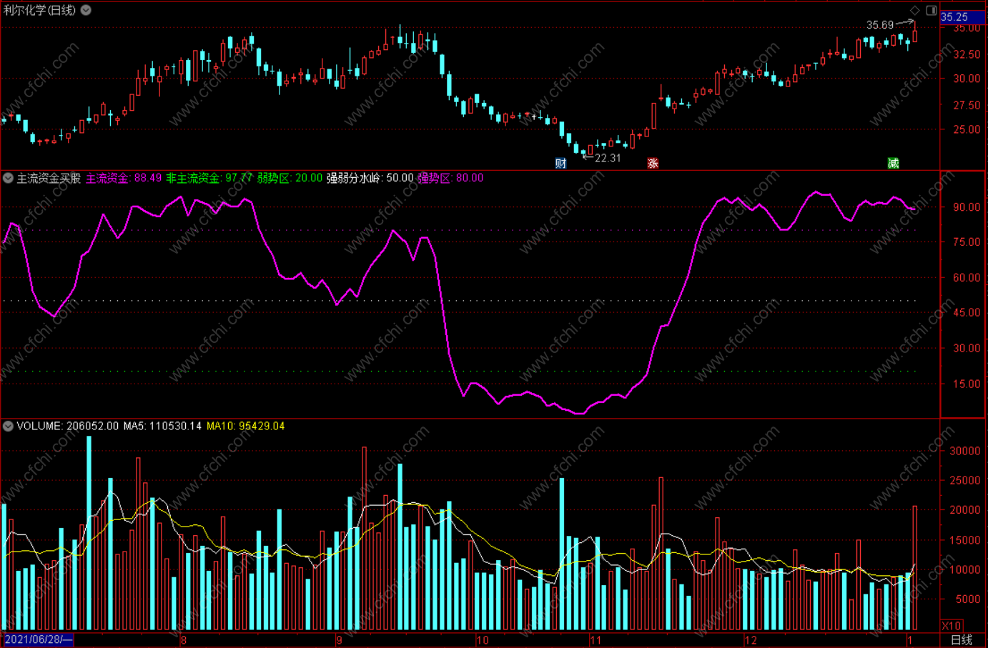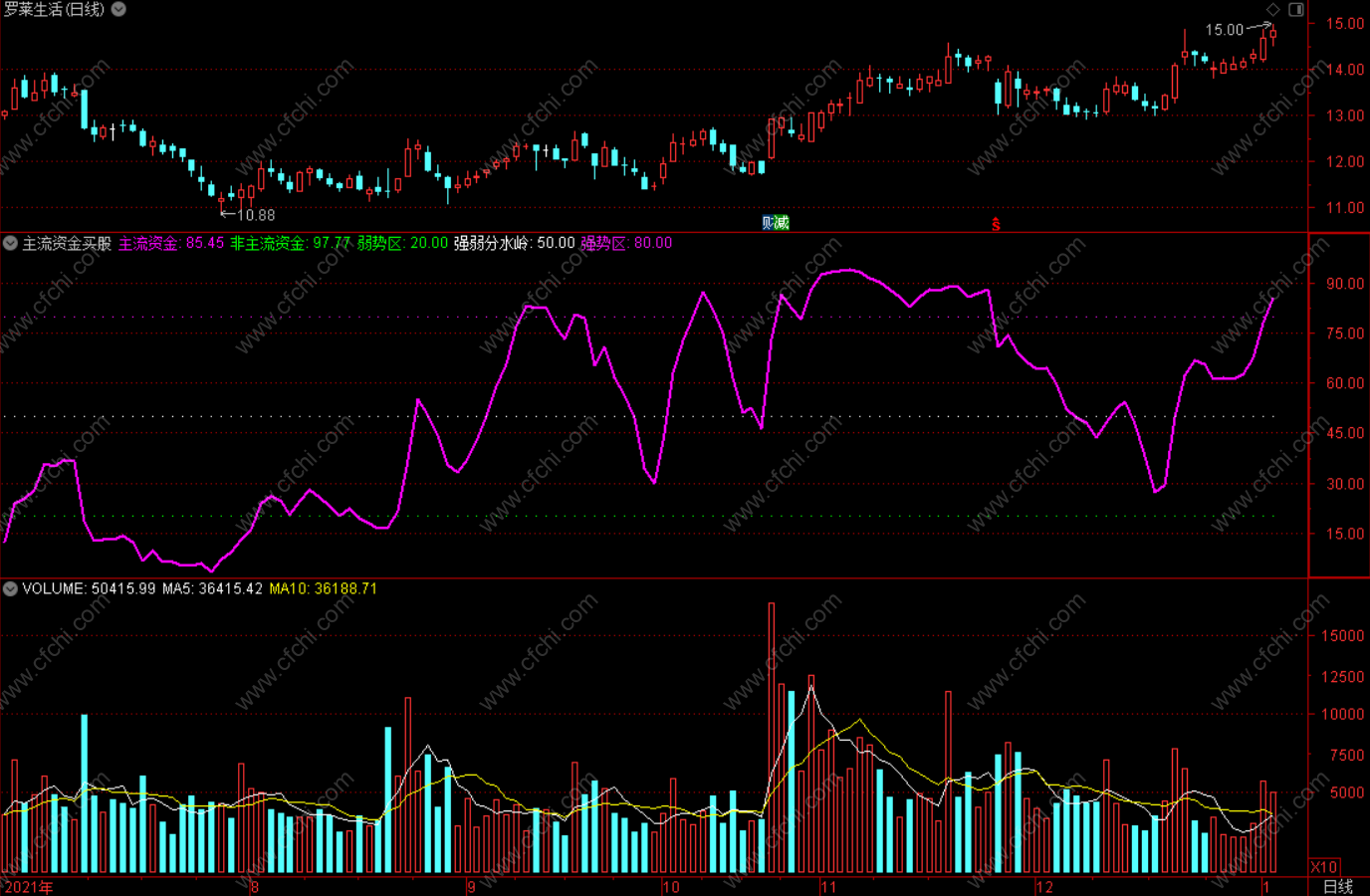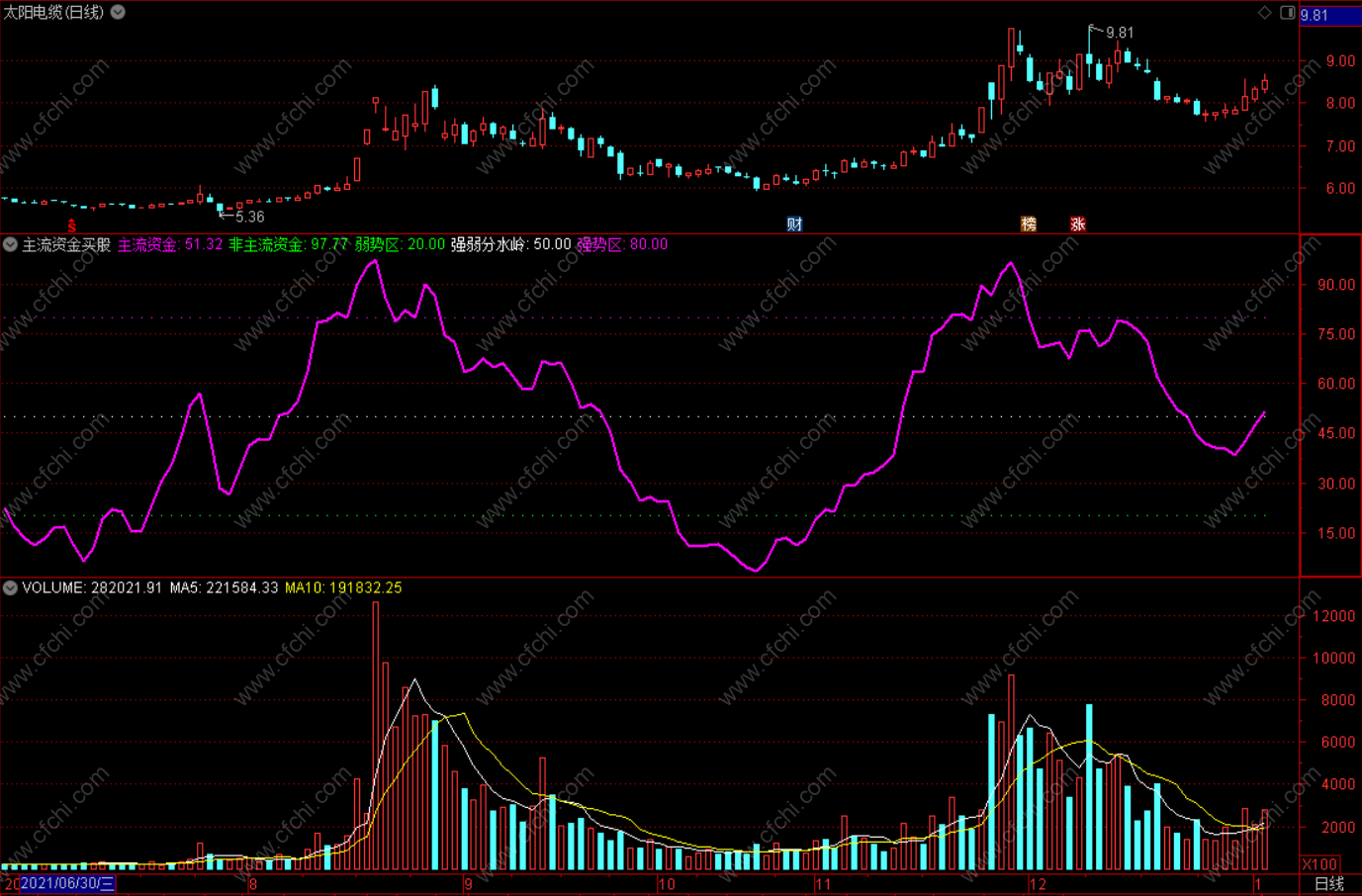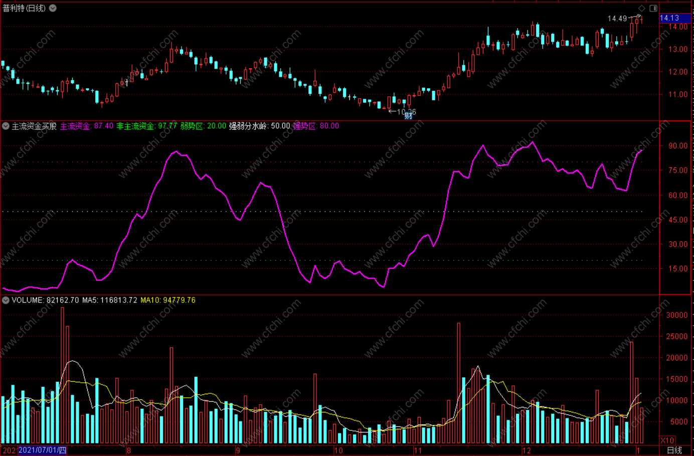 当紫色主流资金摆脱绿色非主流资金上攻,且上穿50,表示主力在投入资金,股价上涨。当主流资金在80以上运行一段时间之后,向下穿越80,显示主力减仓股价可能走弱。