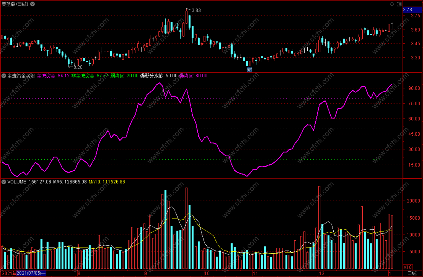 紫色趋势线代表市场主流金,绿色趋势线代表非主流资金。