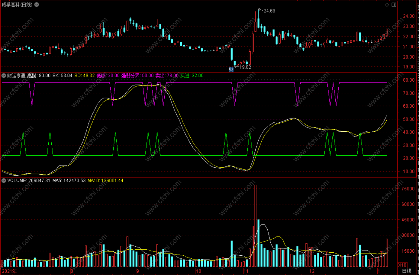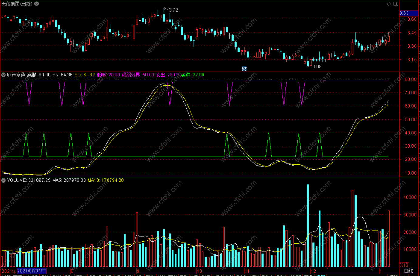 财运亨通”指标为图形化指标。本指标反映的是多空博弈游戏中多空动能、势能交替转换的基本状态,是《庄家克星》系列精华指标之一。 本指标由“SK”、“SD”、80高抛线、20低吸线和“买进”、“卖出”提示线线构成,整幅图形与传统指标“KD”相似,但形态更鲜明,买卖指示更准确,是中长线炒作的有力工具。 操作要领: 1、买点:当“SK”线上翘、并与“SD”线金叉时买入。 2、卖点:当“SK”线下勾、并与“SD”线死叉时卖出。