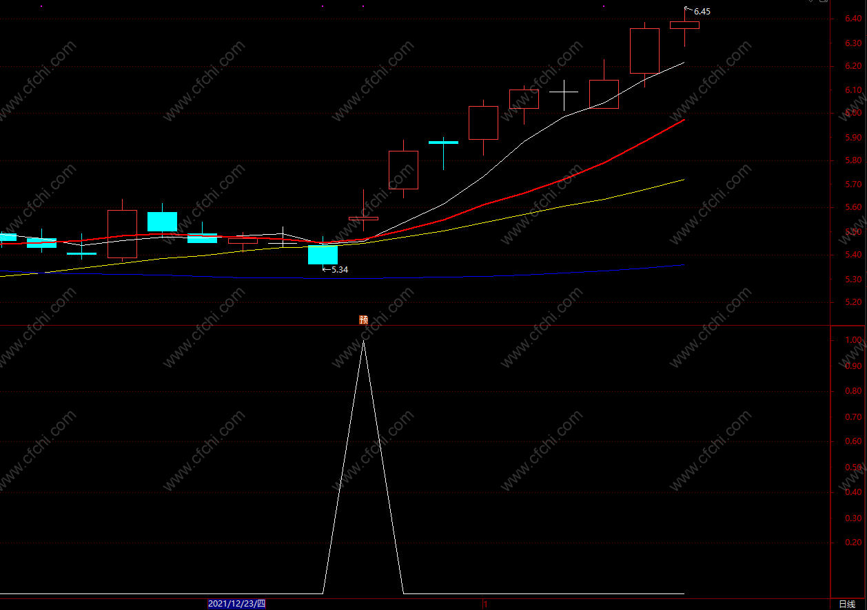 图中所示副图指标中,凸起了一个尖尖的线条,这是买入信号。