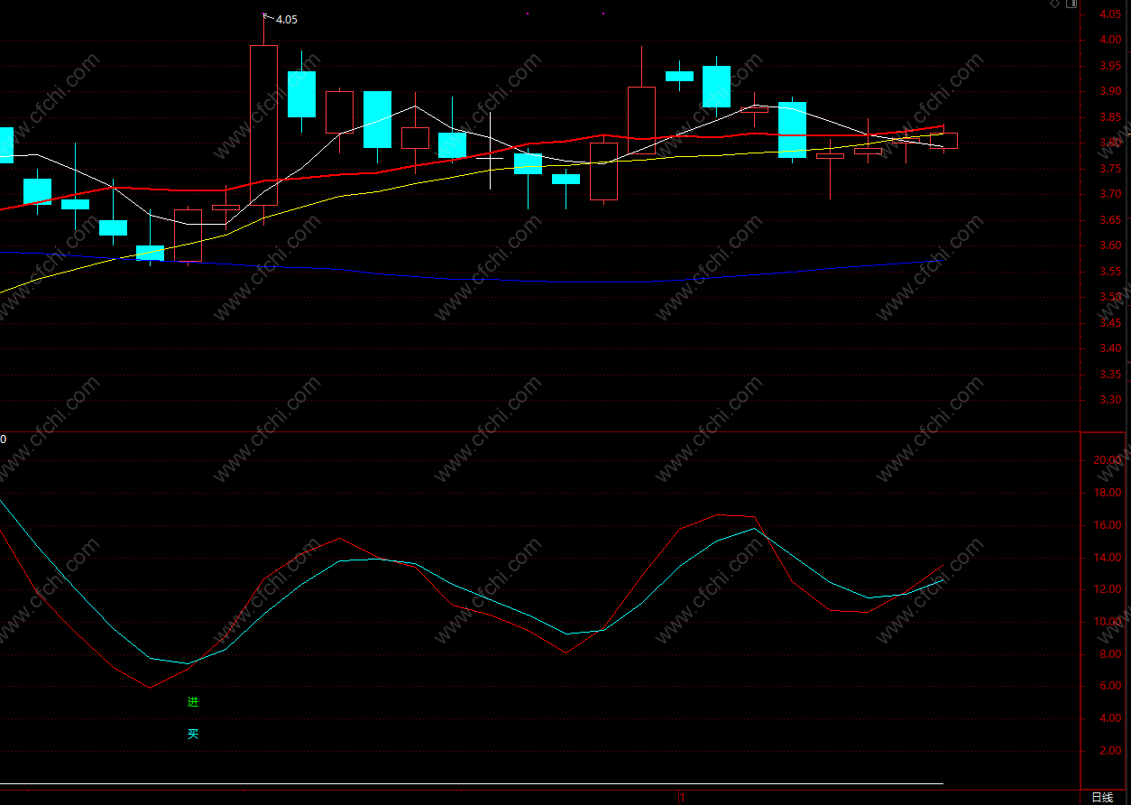 红线下穿卖:EMA(红线上穿买,3),COLORFFFF00;