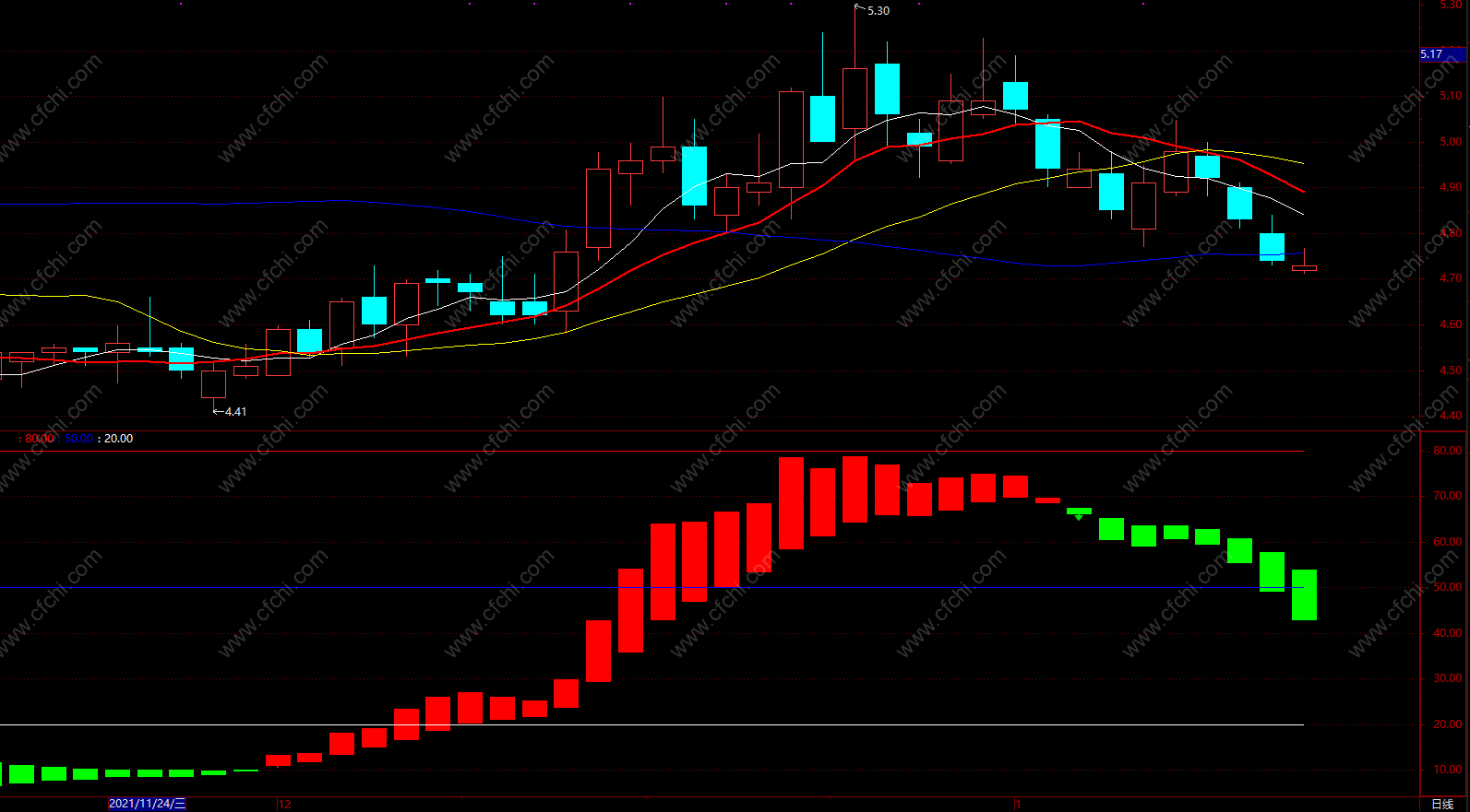 由白柱变红柱出现红箭头买入参考,经过一段上涨后出现绿箭头卖出参考。黄色直线相对低位参考。