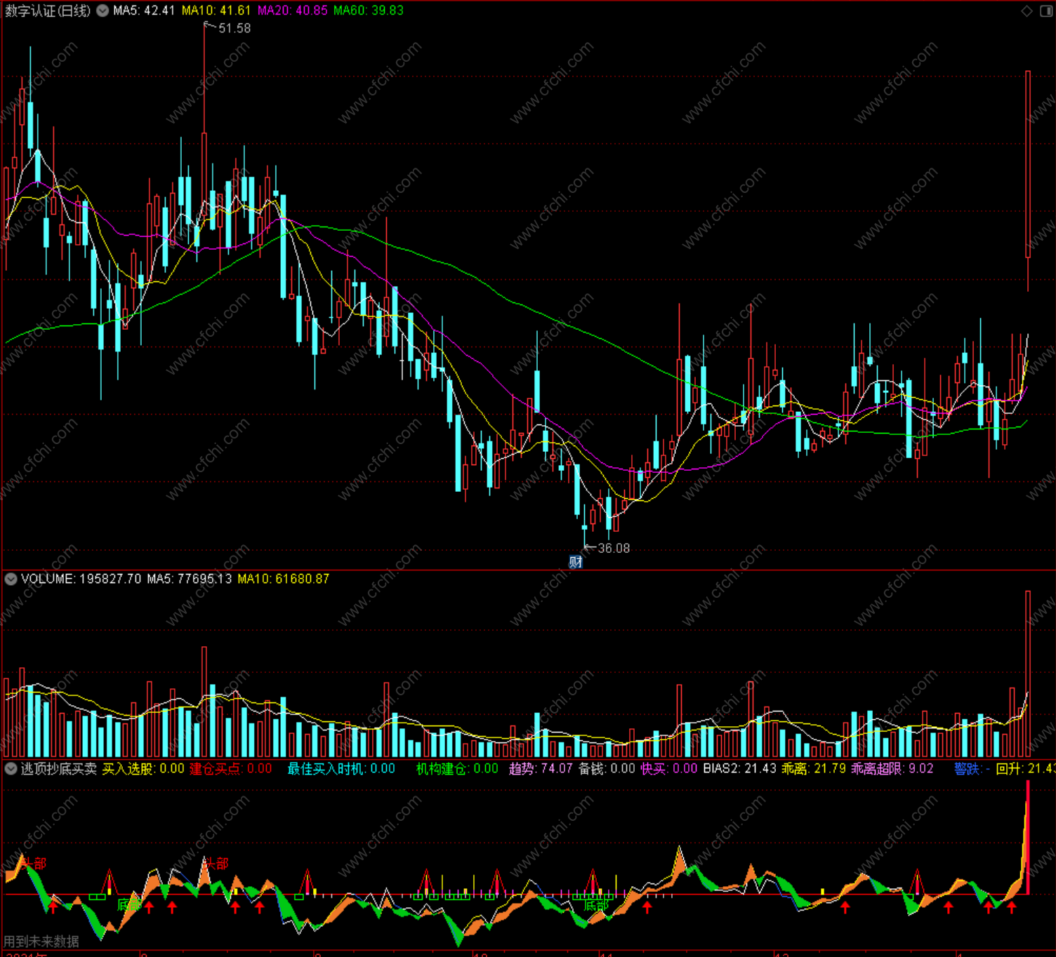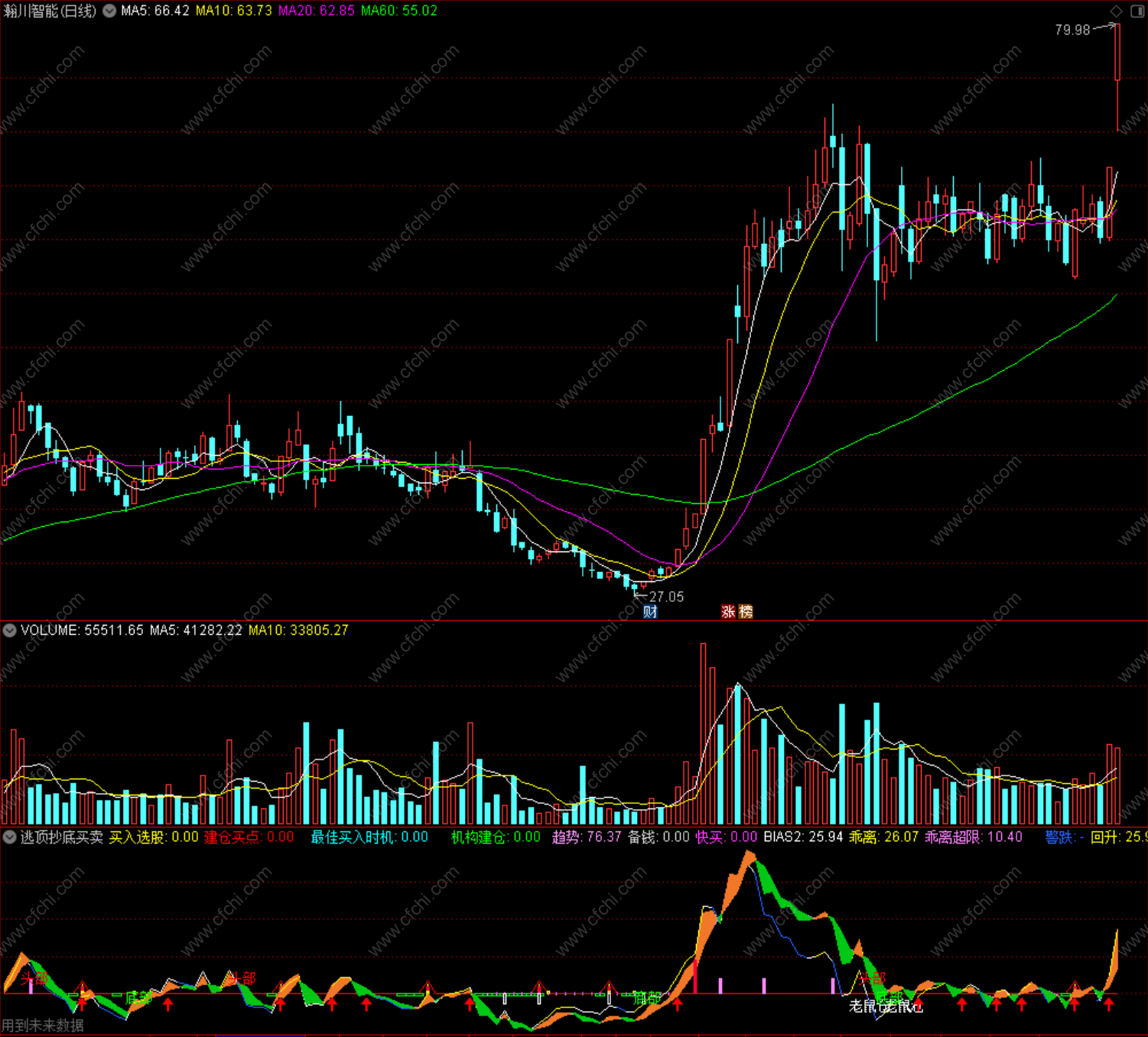 指标内带顶底、买入红箭头,自己慢慢体会。出现底部后参考其他指标买入。