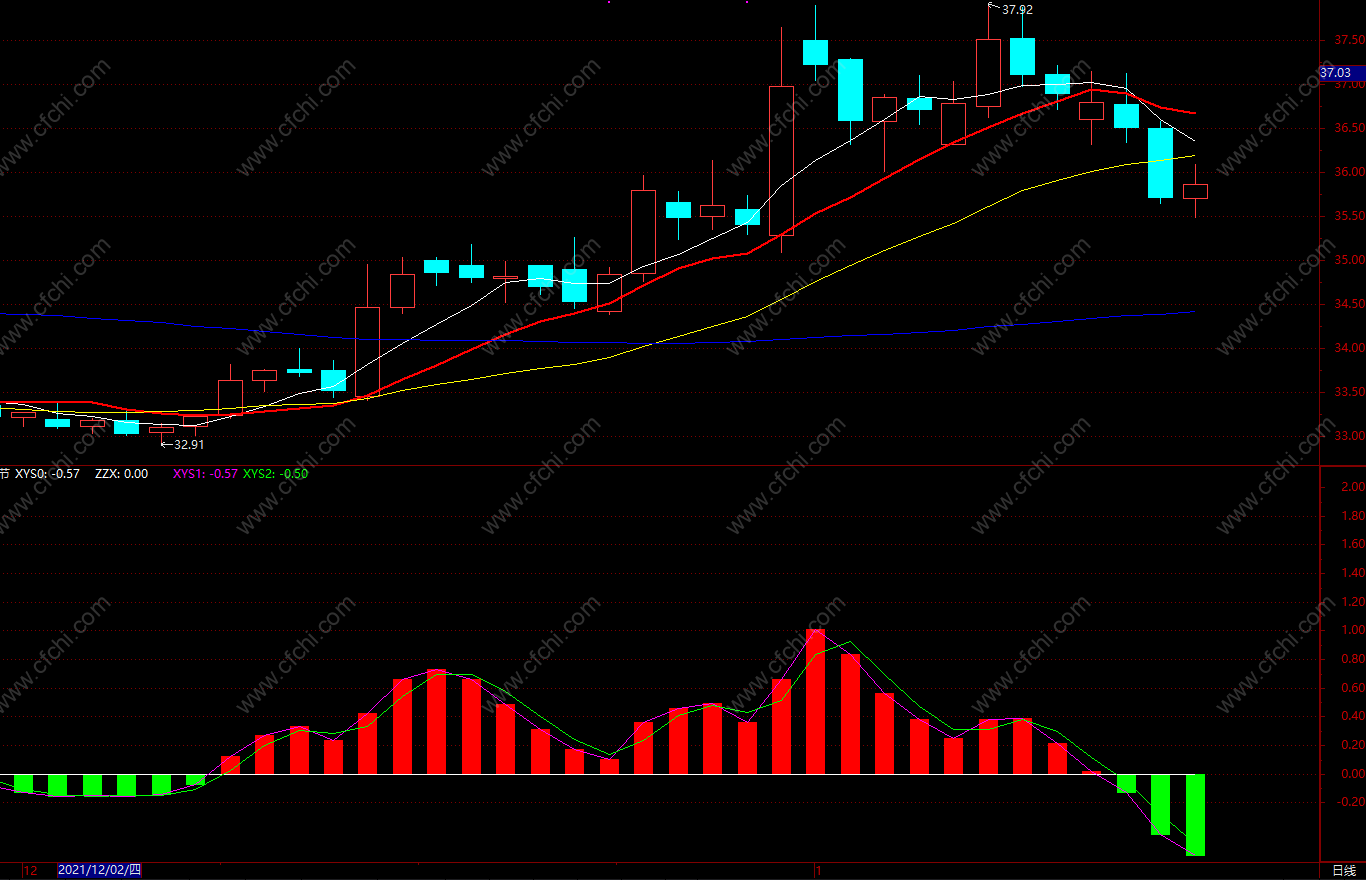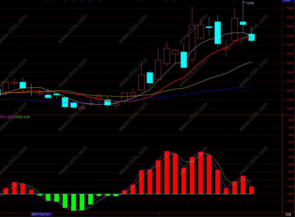 柱外还包括两条线分别是粉色和黄色线,当粉色线上穿黄色线时为捕捞金叉买进信号,当粉色线下穿黄色线时为捕捞死叉卖出信号。