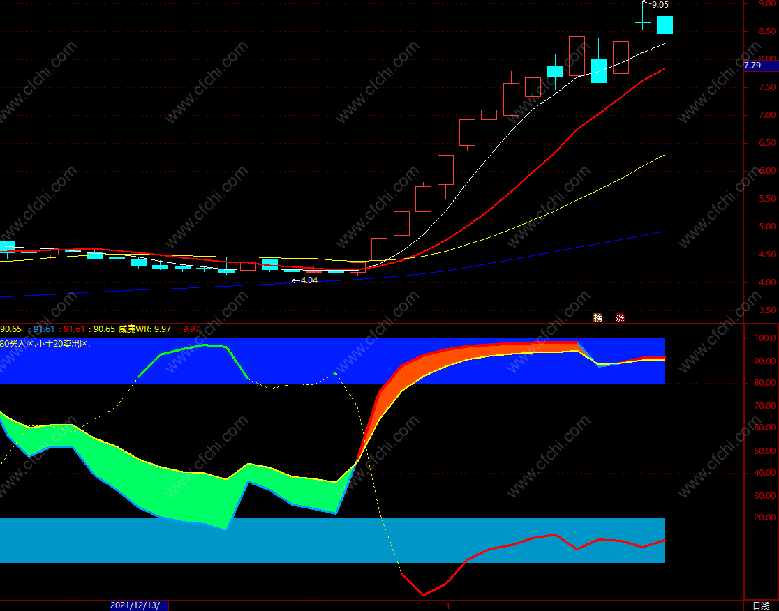 IF(威廉WR>80 ,威廉WR,DRAWNULL),COLOR00FF00,LINETHICK3;