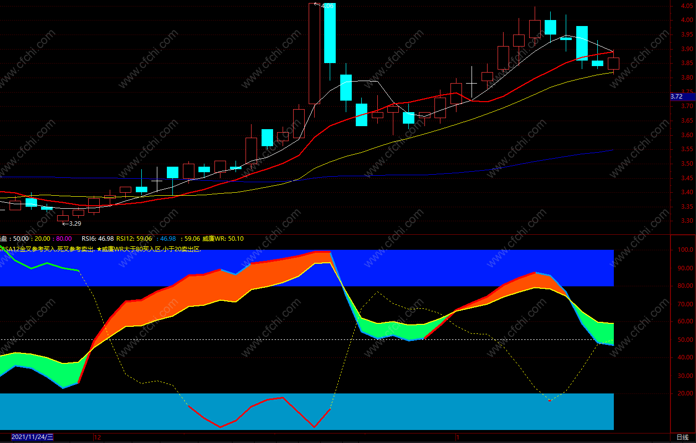 DRAWTEXT_FIX(1,0.02,0,0,'★RSI6与RSA12金叉参考买入.死叉参考卖出. ★威廉WR大于80买入区.小于20卖出区.'),COLOR00FFFF,LINETHICK3;