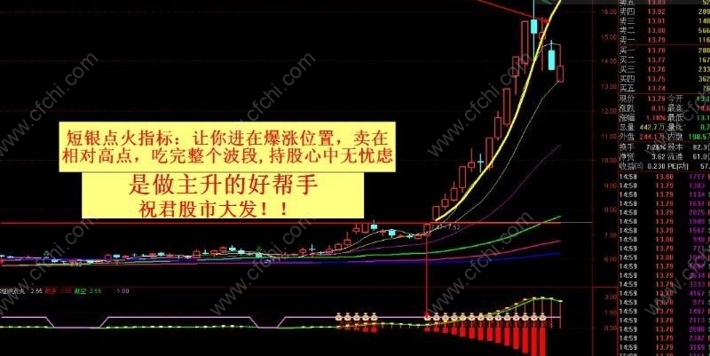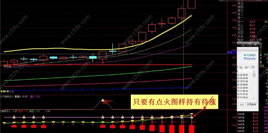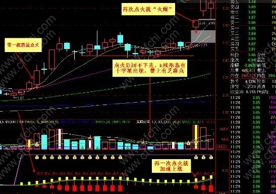 唐老师在校内外讲解启爆个股型态时,为了让同学们更容易理解记忆,在启爆位置形象的引用了一个“点火”动作,经”点火”过的股票就红红火火的涨起来了,因此本人写了一个吻合此思路选股与看盘指标。“点火指标”功效:1能选出个股的波段启涨位置;2能预测未来主力资金的流向(下一热点板块);效果案例如下